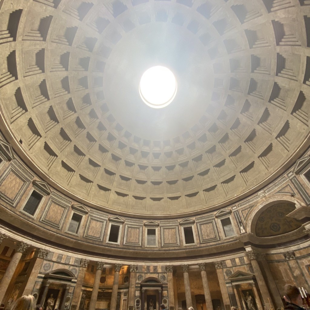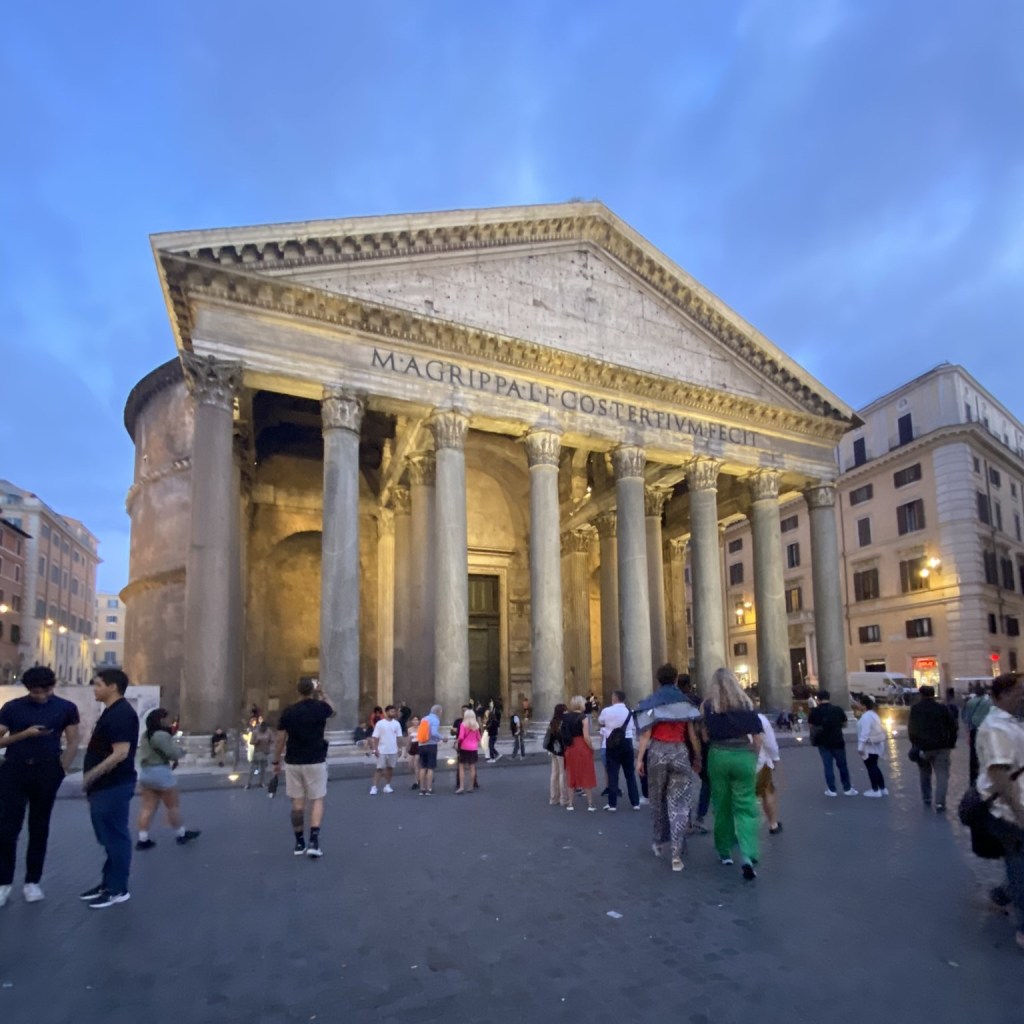 Depois caminhei até a Feira do Campo de Fiori, que acontece de segunda à sábado, das 6h às 14h, onde é possível encontrar queijos, limoncello, especiarias, roupas, lembrancinhas, flores, vale a visita. Saindo dali, fui caminhando até o Pantheon onde eu tinha um horário agendado para a visita. Para entrar no Pantheon eu paguei € 5 pelo ingresso no Site Oficial (aproximadamente R$ 26,72 considerando o cambio da época). Mesmo comprando online, eu precisei ir trocar o ingresso em uma igreja que ficava há uns dois blocos de lá. Não peguei a visita guiada (disponível em outras plataformas como a Get Your Guide), mas lá dentro consegui de forma gratuita um áudio guia, para entender mais sobre tudo que está preservado nesse lugar incrível. O Pantheon hoje é uma igreja católica, mas foi construído inicialmente para ser um templo de culto à todos os deuses. Ele tem um óculo (um buraco) no teto de 9m de diâmetro, sem nenhum tipo de sustentação. Dentro do Pantheon estão sepultados grandes nomes da história Italiana, como o Rei Vittorio Emanuele II, o Pintor Renascentista Rafael, a Rainha Margherita da Saboia, entre outros.