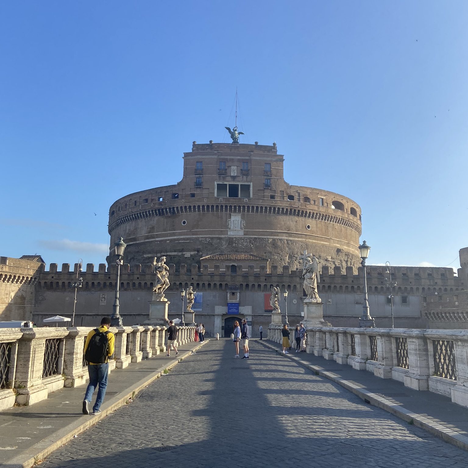 Depois de explorar o Vaticano, fiz uma parada para o almoço, e depois decidi visitar o Castelo de Sant’Angelo, uma fortaleza imponente que foi originalmente construída como mausoléu para o imperador Hadriano. Ao longo dos séculos, o castelo foi transformado em uma residência papal e, mais tarde, em uma fortaleza militar. O mais interessante é a Passarela do Papa, uma passagem secreta que conecta o castelo ao Vaticano, permitindo que os papas escapassem em caso de perigo. Para visitar o Castelo paguei € 30 no ingresso com áudio guia no Get Your Guide (aproximadamente R$ 171,83, considerando o câmbio da época). Saindo do castelo, atravessei a Ponte Sant’Angelo, uma das pontes mais fotogênicas de Roma, decorada com estátuas de anjos, e fui em direção à Trastevere.