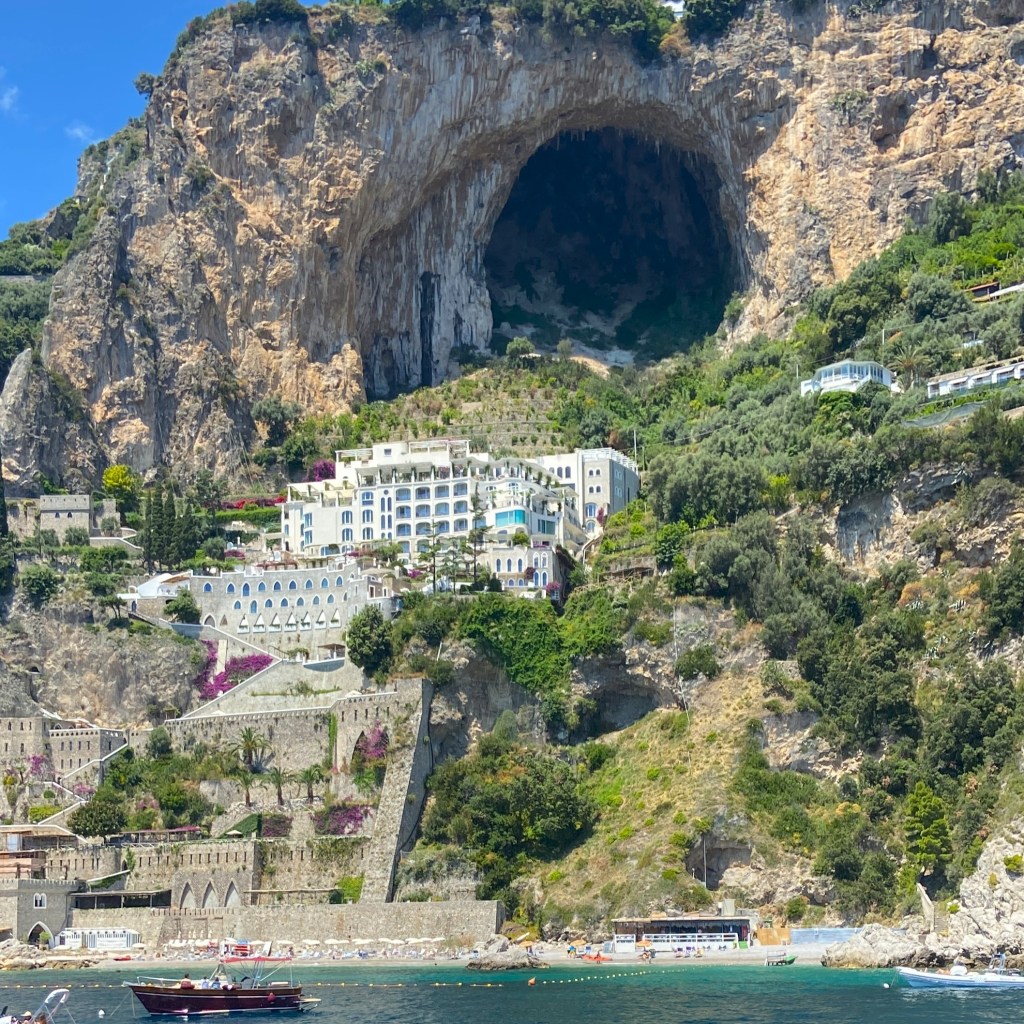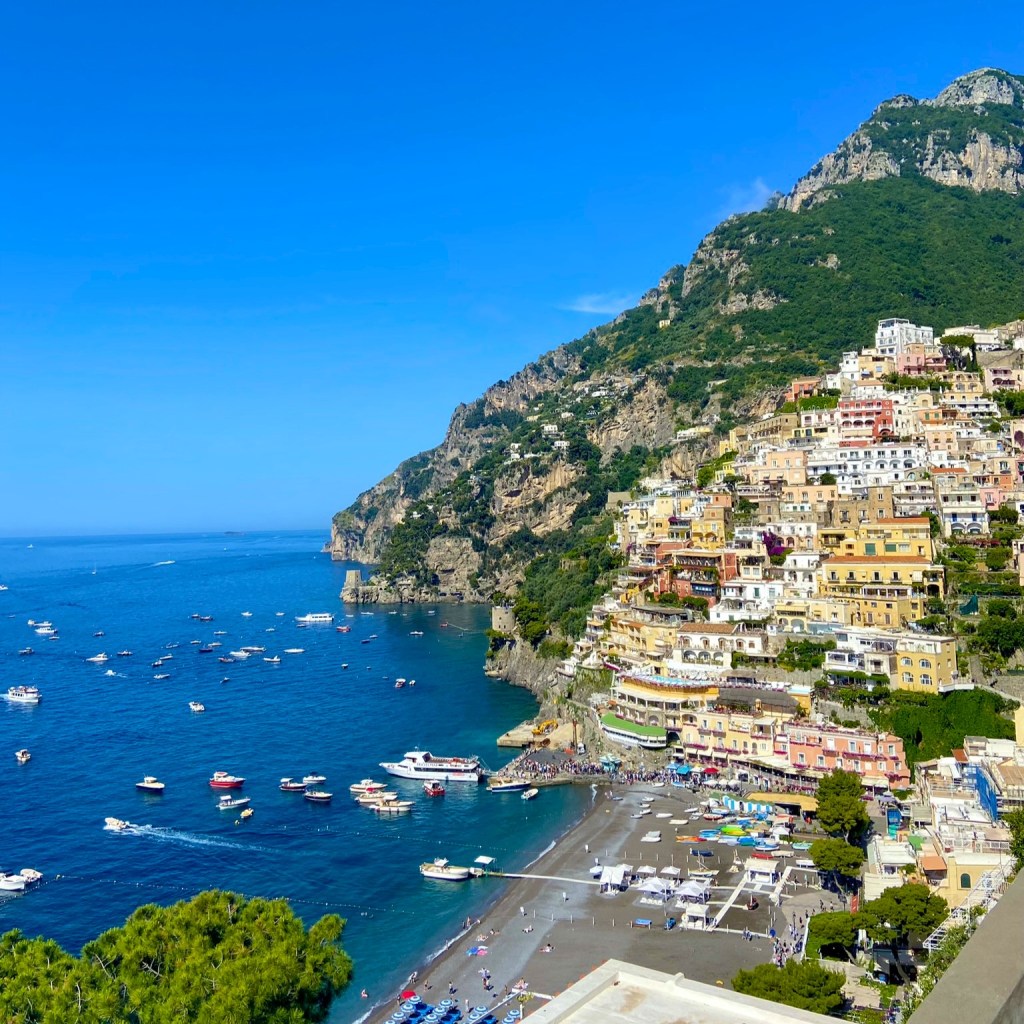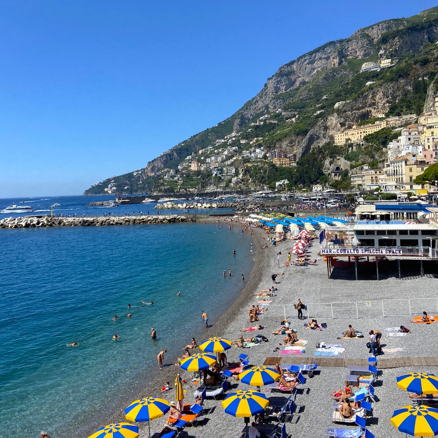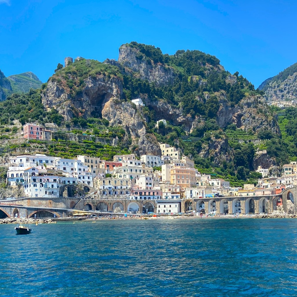 O passeio começou por Positano, a cidade que parece uma pintura emoldurada pelas montanhas e o mar. Positano já foi um pequeno vilarejo de pescadores até se tornar um destino de glamour nos anos 1950, atraindo estrelas de cinema e artistas. Uma curiosidade é que as roupas fluidas e coloridas vendidas nas lojinhas locais deram origem à “moda Positano”, famosa até hoje. Caminhamos pelas ruas cheias de boutiques e descemos até a Spiaggia Grande, a praia principal, que oferece uma vista espetacular das casinhas coloridas empilhadas na encosta. No meio do caminho passei pela a Igreja de Santa Maria Assunta, que abriga uma antiga imagem da Virgem Maria, ligada a lendas locais de marinheiros.