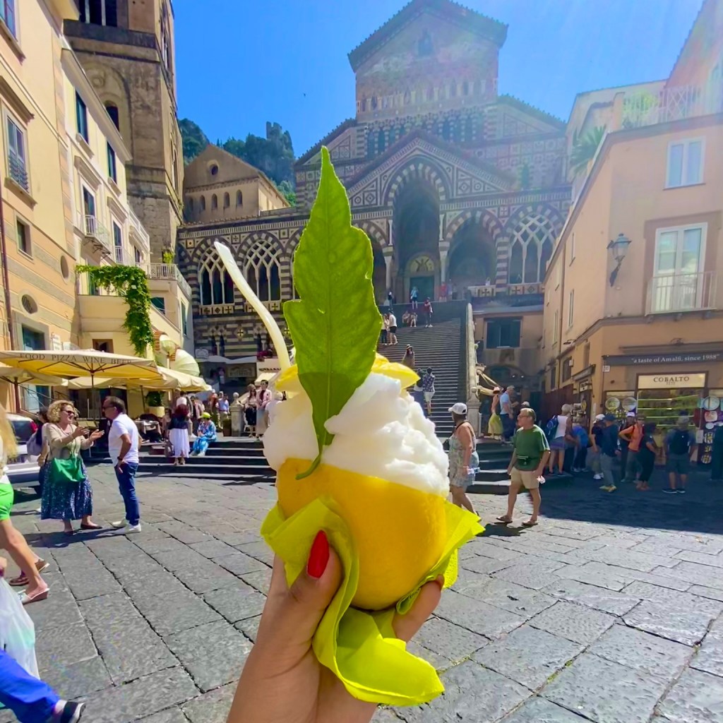 De lá, seguimos para Amalfi, que foi uma poderosa república marítima na Idade Média. Amalfi é cheia de história, e sua importância econômica e cultural era tanta que deu seu nome às famosas Tábuas Amalfitanas, um dos primeiros códigos de navegação do mundo. O destaque é a Catedral de Sant’Andrea, com sua mistura de estilos arquitetônicos que reflete a influência árabe e normanda. Em Amalfi experimentei o famoso sorbet no limão de Amalfi: Uma delícia!