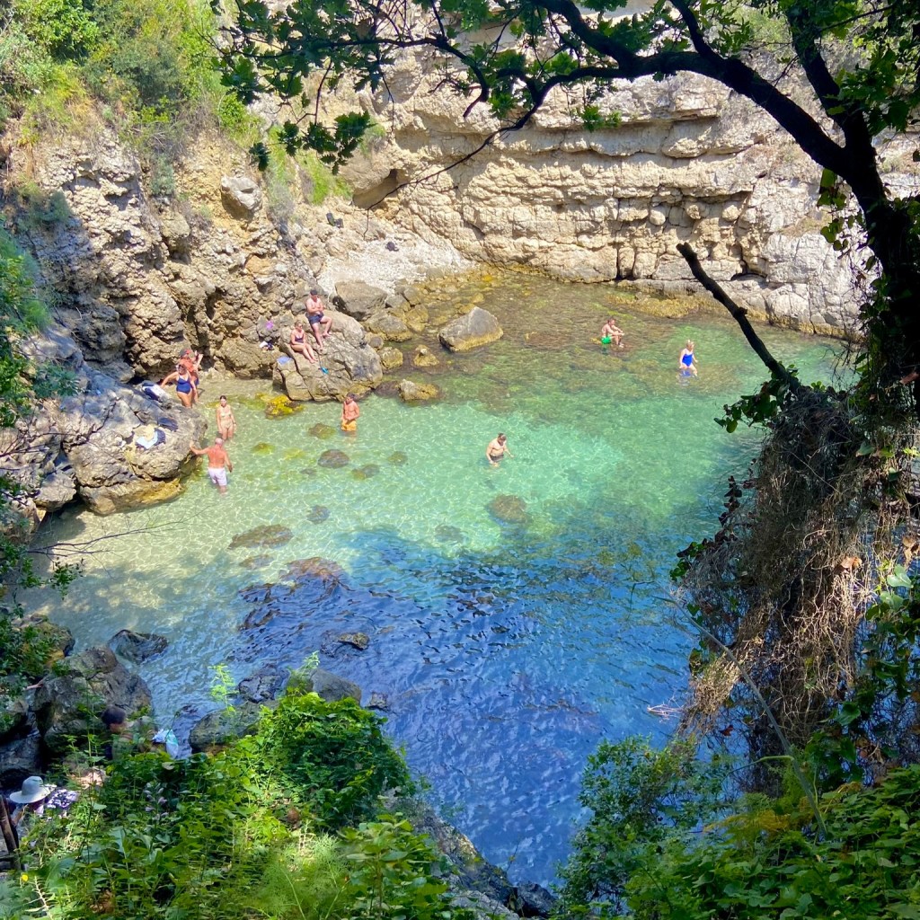 No meu último dia, meu ônibus de retorno à Roma só partiria à tarde, então aproveitei esse meio período para aproveitar Sorrento mais um pouquinho, mas dessa vez explorando uma atração menos conhecida: O Bagno Regina Giovanna, que fica a uma curta distância do centro da cidade. É uma baía encantadora, cercada por falésias e conhecida por suas águas cristalinas. O nome remete à lenda de que a rainha Giovanna de Anjou costumava tomar banhos nesse local no século XIV. Para chegar lá, é preciso seguir uma trilha a partir de Sorrento, que atravessa um cenário de vegetação mediterrânea e leva até uma piscina natural formada pelo mar, que é protegida por rochas, criando um ambiente tranquilo e isolado.