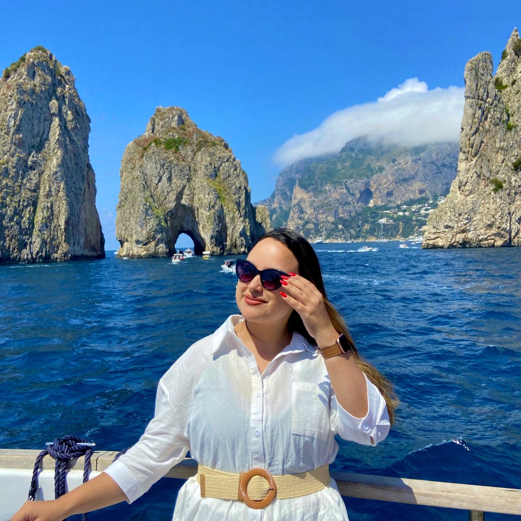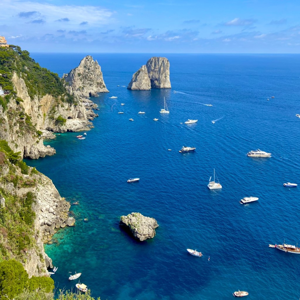 Comecei o seu dia em Sorrento, pegando um barco para Capri, uma viagem rápida de 20 a 30 minutos. Ao chegar, fiz um passeio pelo porto de Marina Grande, com suas lojinhas e restaurantes, e já me apaixonei pela vista. Em seguida, embarquei no passeio de barco ao redor de Capri, onde pude ver de perto as famosas Grutas da Ilha de Capri (a mais famosa é a Gruta Azul, mas como eu estava em um barco grande, não entramos). Ao longo do passeio passamos pelo Faraglioni, três pedras gigantes que emergem do mar e são o cartão portal da Ilha e pelo Buraco de Tibério, uma grande abertura nas falésias que remonta ao período romano. Diz a lenda que o imperador Tibério, que governava a Roma antiga, jogava inimigos ou prisioneiros neste buraco como uma forma de punição.