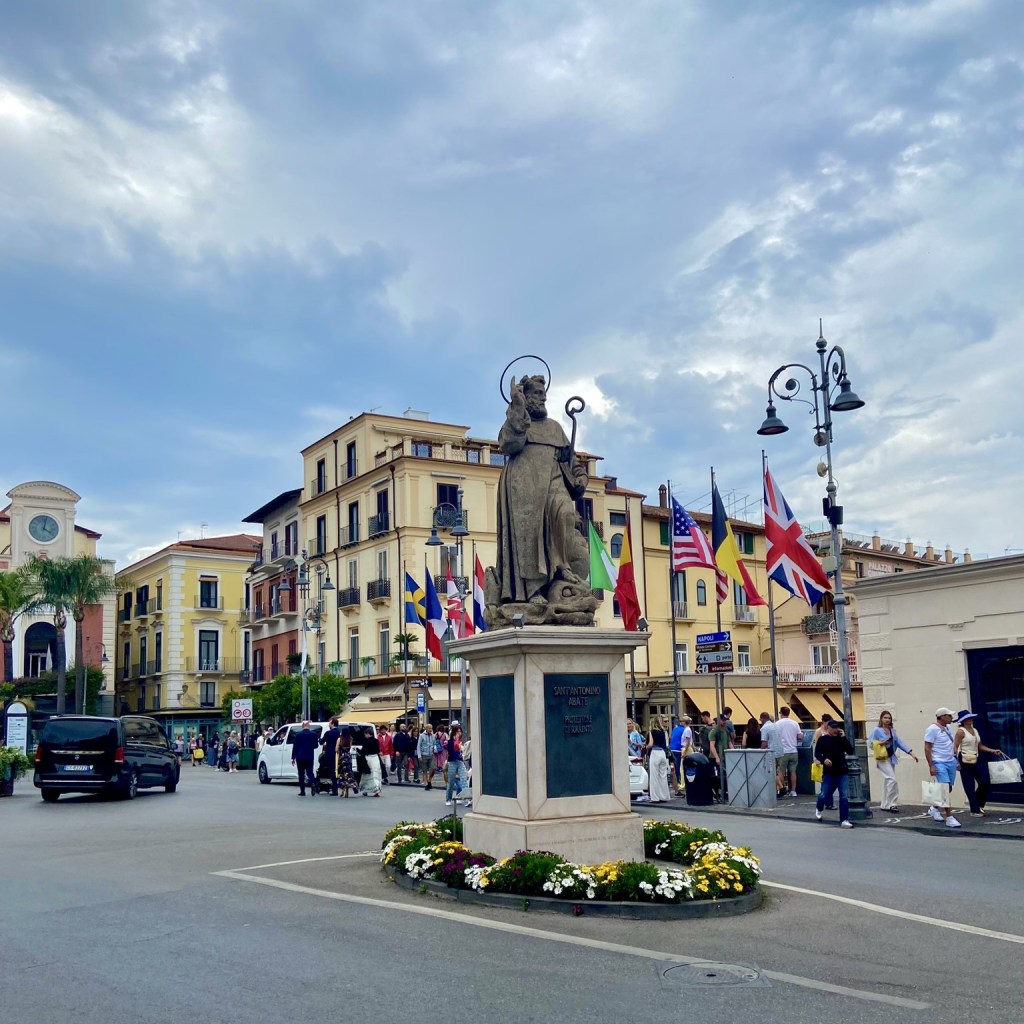 Cheguei em Sorrento às 14:00 da tarde, fiz logo check-in no hotel e já saí para explorar a cidade. Como é uma cidade pequena, dá pra explorar a pé e conhecer os principais pontos em poucas horas. Comecei pelo Vallone dei Mulini, um vale misterioso bem no coração de Sorrento. Lá, as ruínas de antigos moinhos cobertas por vegetação formam uma cena digna de cartão-postal. É fácil de achar: fica logo abaixo da rua principal, perto da Piazza Tasso. Falando nela, a Piazza Tasso foi o próximo destino. Esse é o ponto central da cidade, cheio de cafés, restaurantes e um clima vibrante. É o lugar perfeito pra sentir a energia local, tomar um Aperol Spritz ou experimentar um gelato enquanto aprecia o vai e vem das pessoas.