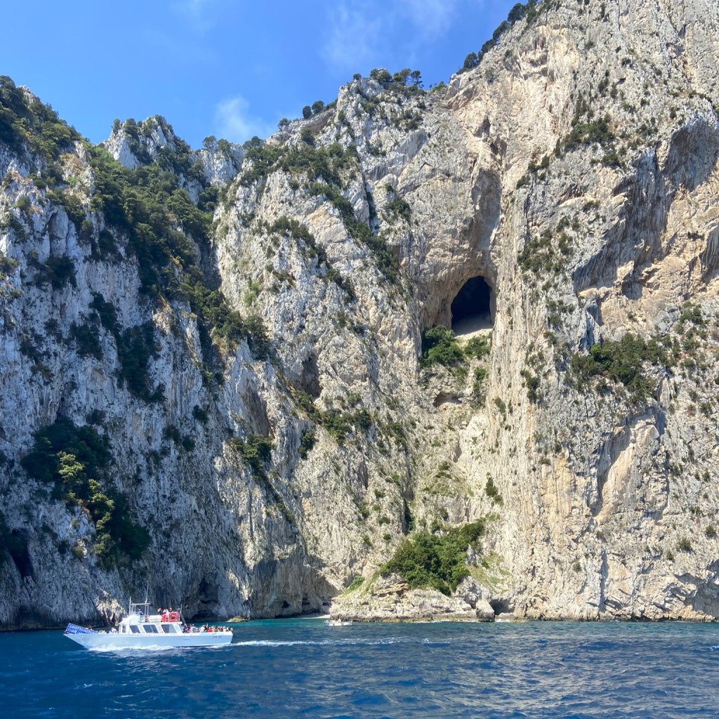 No meu terceiro dia na Costa, contratei uma agência para fazer um passeio de um dia para a Ilha de Capri. Foi um passeio em um grupo grande (umas 20 pessoas). O passeio incluia o barco de Sorrento até Capri, o ônibus até Anacapri e Capri e o Passeio de Barco ao Redor da Ilha de Capri. O passeio custou € 60 (aproximadamente R$ 343,66 considerando o câmbio da época). A dona do hotel em que fiquei que agendou os passeios para mim, mas existem muitas agências de passeios que fazem esse tipo de tour por lá. Dá para ir de ferry convencional até Capri e fazer os passeios por conta, mas o maior perrengue lá é o transporte para subir para Anacapri e Capri, porque as estradas são estreitas e os ônibus são pequenos, e ir por conta pode te fazer perder muito tempo esperando transporte. Dá para subir a pé da Marina Grande até Capri – para quem tem disposição – e também de funicular, mas dependendo da época do ano as filas são enormes. Ir com agência otimizou muito o meu tempo, não perdi tempo esperando ônibus, pois a agência tinha o próprio veículo. Sobre o passeio ao redor da ilha: recomendo, para quem está viajando em grupos, alugar barco particular: dividindo o valor por pessoa não fica caro, e é possível entrar nas grutas da ilha, coisa que barcos maiores não conseguem.