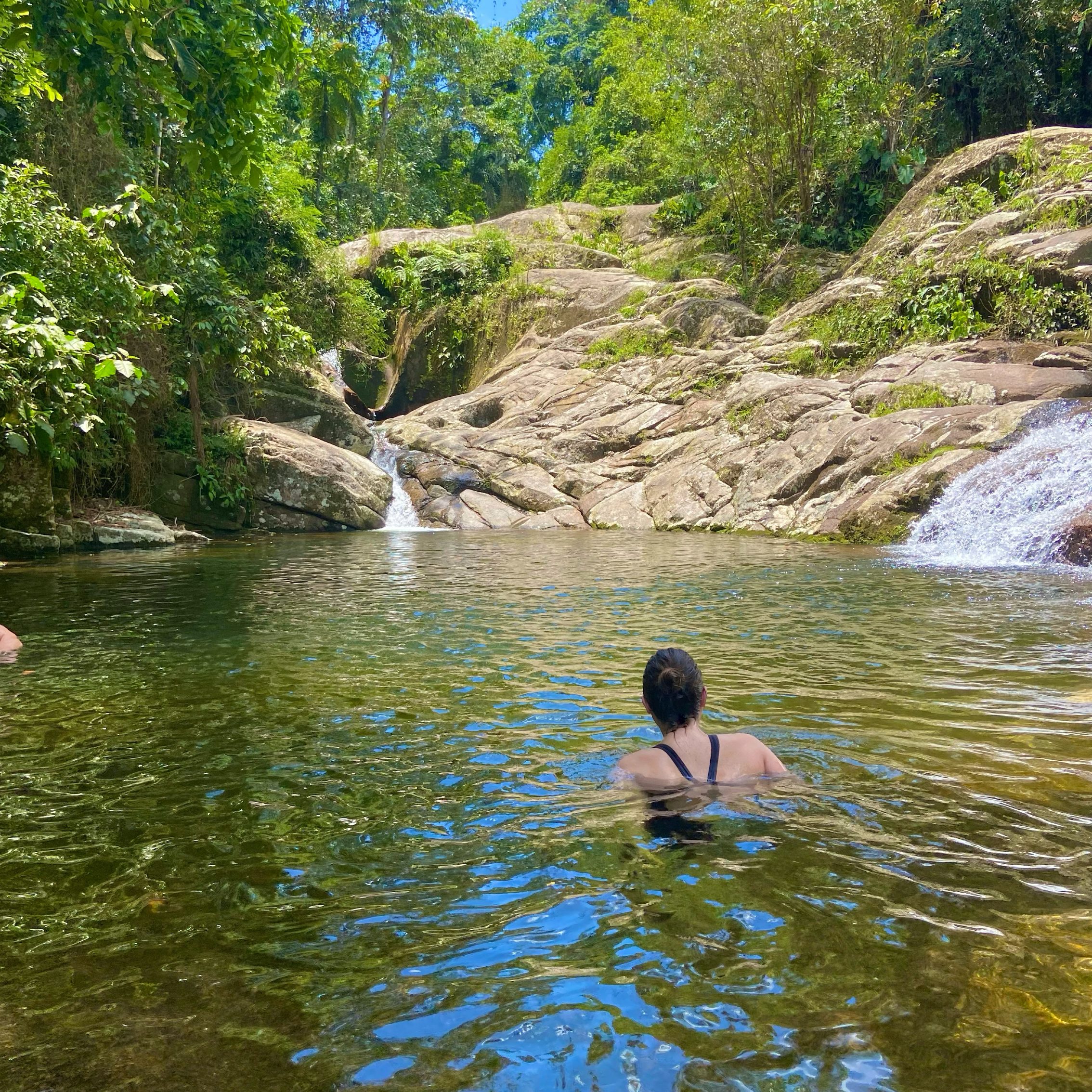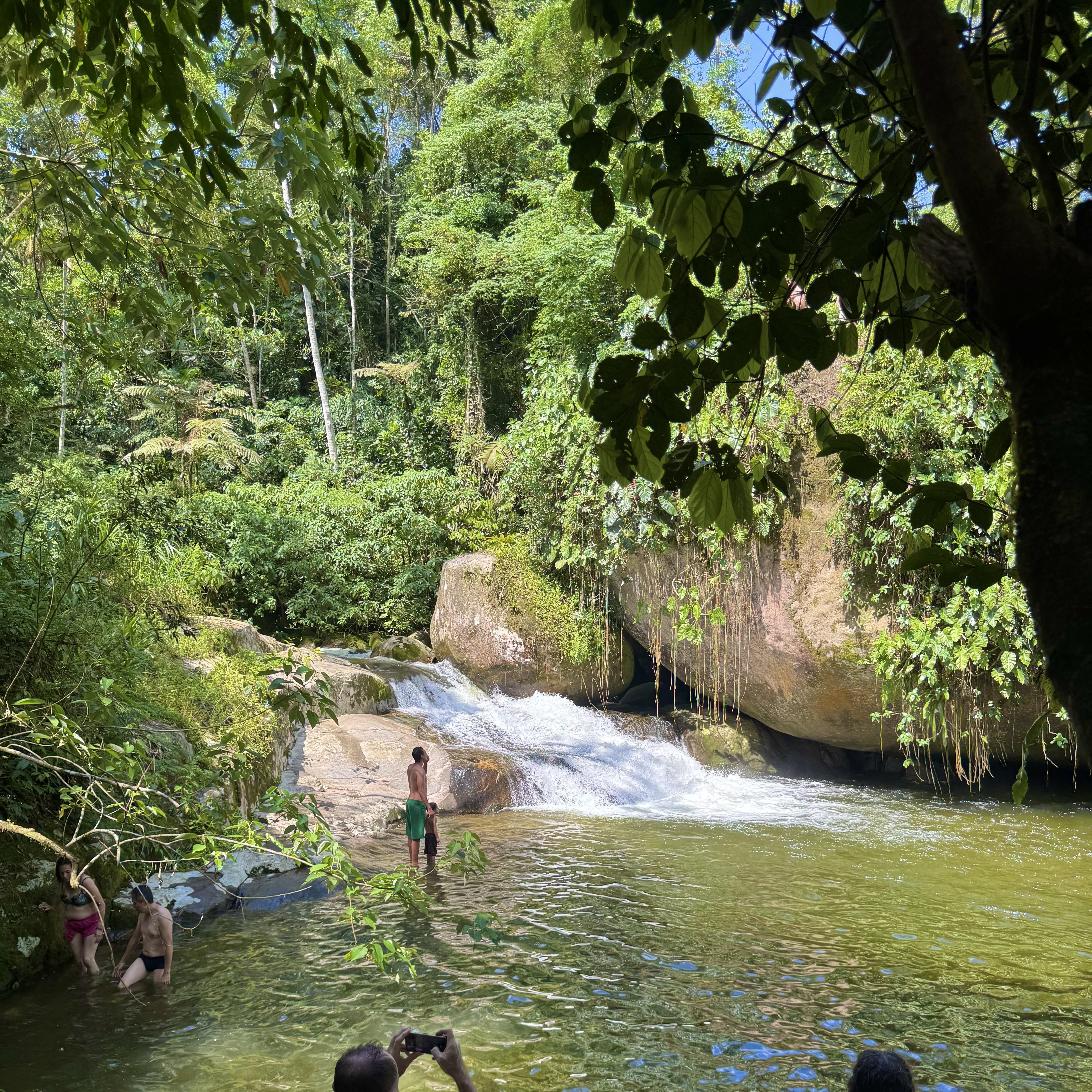 Seguindo o roteiro, chegamos na cachoeira mais radical: A Cachoeira do Tobogã que é uma das atrações mais procuradas no tour das cachoeiras de Paraty. O nome vem da pedra lisa e escorregadia que forma um “tobogã natural”, onde os visitantes deslizam até um poço de água profundo. Além da diversão garantida, a experiência é rodeada por uma paisagem deslumbrante, com muito verde e o som relaxante da água. Eu fiquei com medo de escorregar e não desci, mas ainda assim aproveitei o ambiente e pude ver meus colegas de grupo se aventurarem nessa cachoeira.