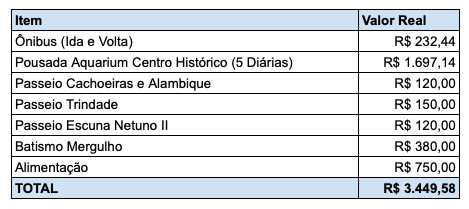Esses são os valores que paguei na viagem. Na prática paguei um pouco menos do que está listado abaixo, pois consegui descontos no hotel e em alguns passeios com milhas acumuladas, mas segue os valores originais: