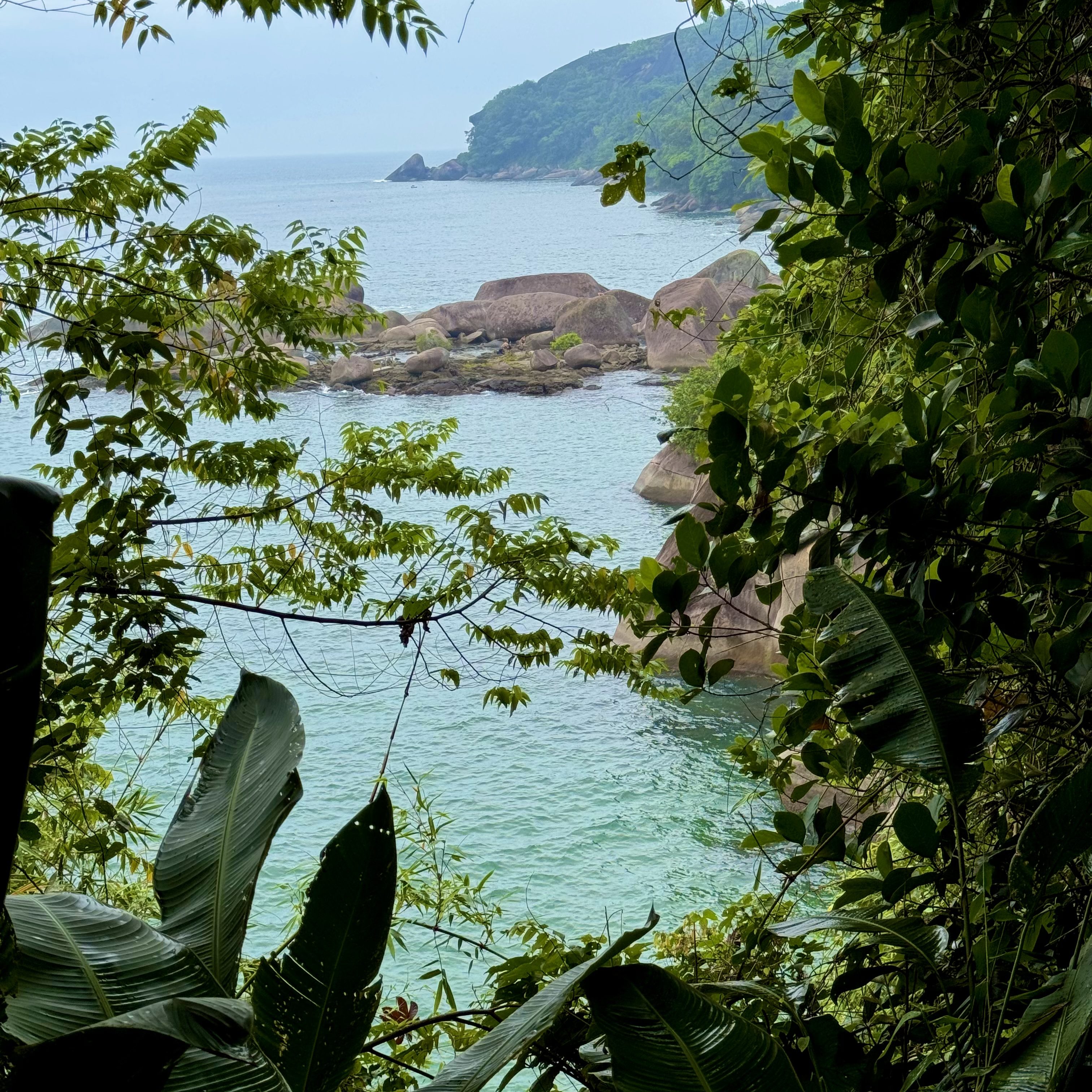 Depois seguimos a pé para o Parque Nacional da Serra da Bocaína, rumo à Praia do Meio. Essa é a última praia onde a pessoa pode escolher entre ir de barco até as piscinas naturais ou de trilha. Cada trecho de barco custa R$ 20, e como grupo optamos por ir de trilha e voltar de barco. Foi a melhor escolha, pois a trilha é incrível, com vistas lindas para Trindade. Depois seguimos para a famosa Praia do Cachadaço, um dos principais destinos do tour. Para chegar até lá, os turistas fazem uma caminhada de aproximadamente 15 minutos por uma trilha fácil, cercada pela vegetação exuberante da Mata Atlântica. A trilha leva os visitantes até a praia, que oferece um cenário deslumbrante, com águas calmas e rodeada por grandes pedras.