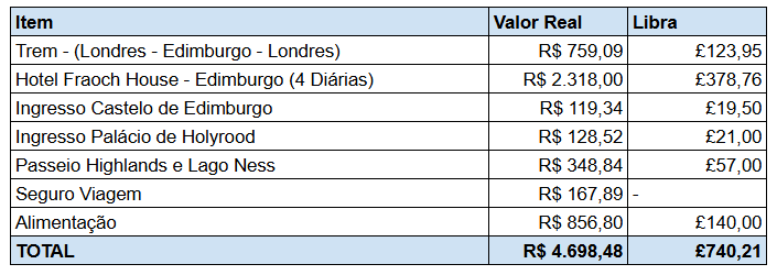 Abaixo está listado apenas os custos de uma viagem para Edimburgo, mas aproveitei essa viagem para conhecer outra região do Reino Unido: Londres, na Inglaterra. Logo, meus custos de aéreo entre o Brasil e o Reino Unido foram otimizados. Caso você se interesse por fazer um combo de viagem Londres + Edimburgo, clique aqui para ver os custos específicos dessa extensão de viagem. Na prática paguei um pouco menos do que está listado abaixo, pois consegui descontos no hotel e em alguns passeios com milhas acumuladas, mas segue os valores originais: