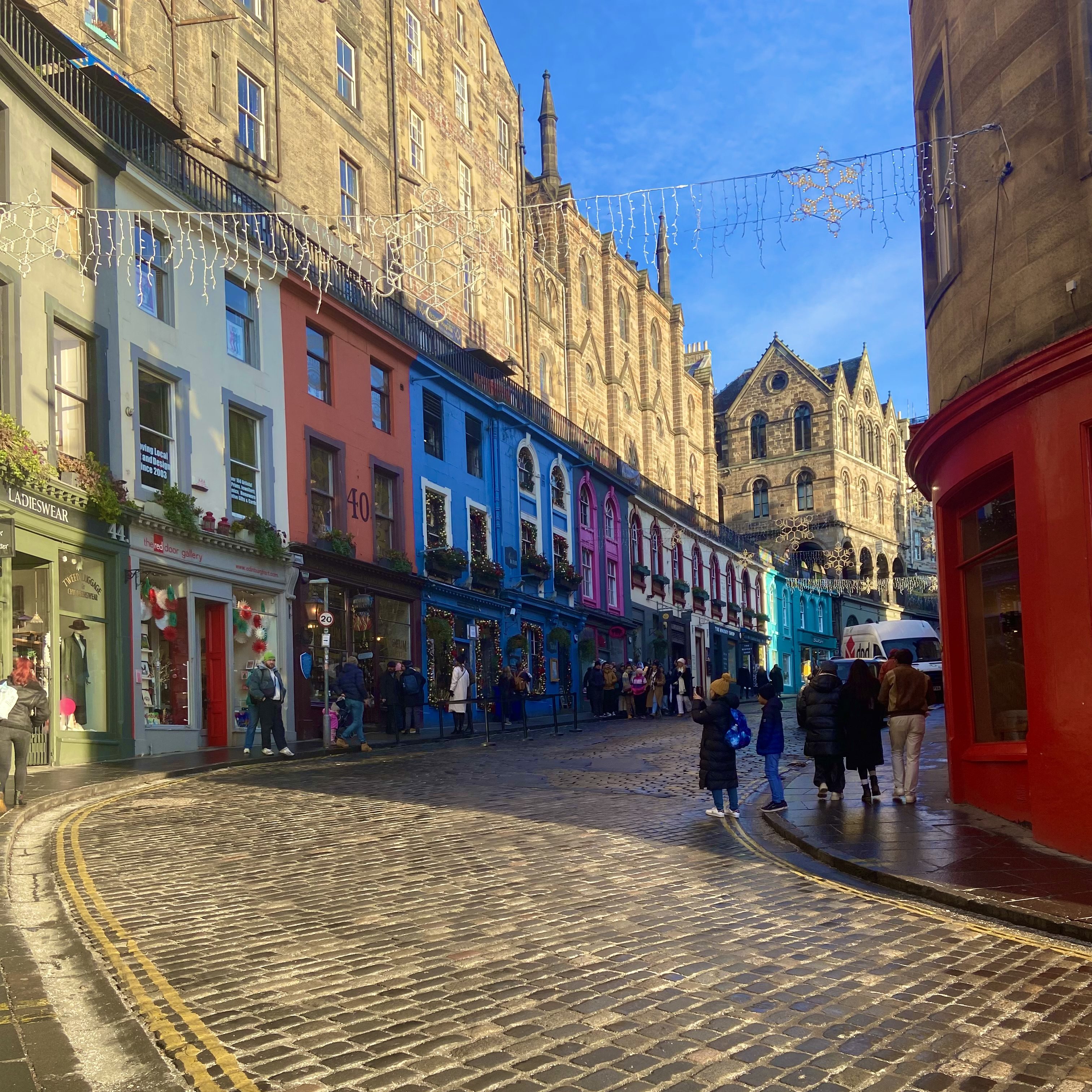 A poucos minutos dali, visitei o National Museum of Scotland, um verdadeiro tesouro para quem gosta de história e cultura. O museu é enorme e tem exposições que vão desde arqueologia e tecnologia até moda e ciência. Um dos destaques é a ovelha Dolly, o primeiro mamífero clonado do mundo, que está embalsamada por lá. Outra curiosidade é que o museu tem um terraço com uma vista panorâmica incrível da cidade, então não deixe de subir! A entrada é gratuita, então dá para explorar sem pressa e sem pesar no bolso. Saindo do museu, segui para uma das ruas mais fotogênicas da cidade: a Victoria Street. Suas casas coloridas e inclinadas abrigam lojas peculiares, desde livrarias até lojas de magia inspiradas no universo de Harry Potter – dizem que essa rua foi a inspiração para o Beco Diagonal! No final da rua, cheguei à animada Grassmarket, uma praça que já foi um mercado medieval e até cenário de execuções públicas (Edimburgo tem um passado sombrio, marcado pela Guerra e pela herança dos clãs). Hoje, é um dos lugares mais vibrantes da cidade, cheio de pubs e restaurantes, perfeito para uma pausa.