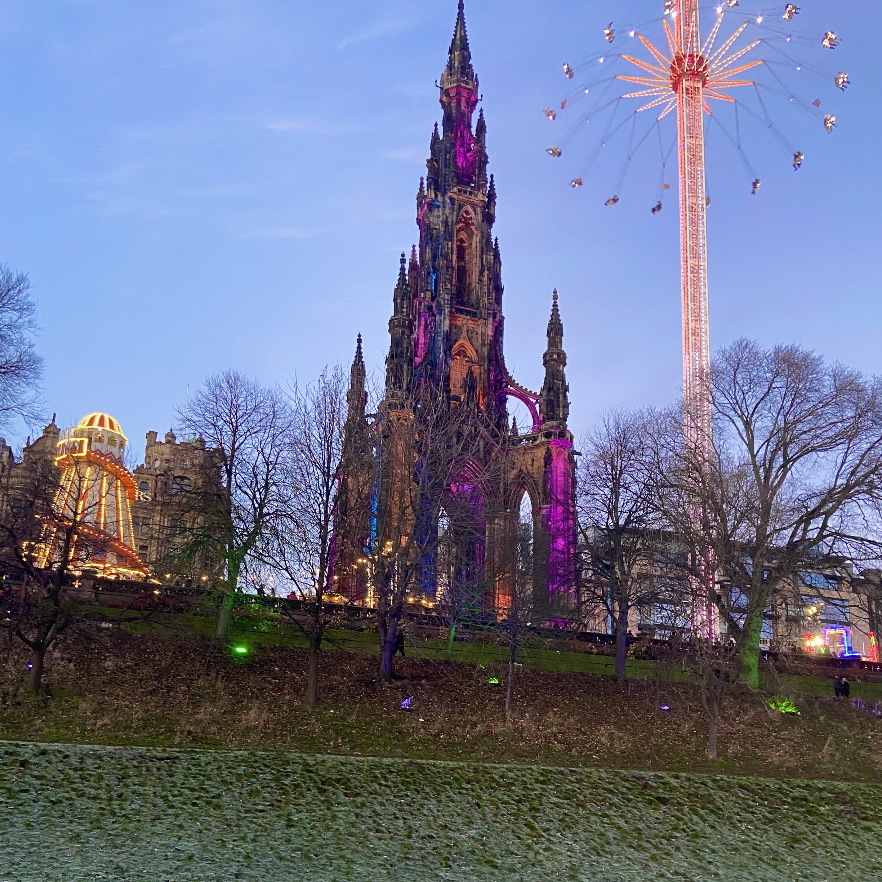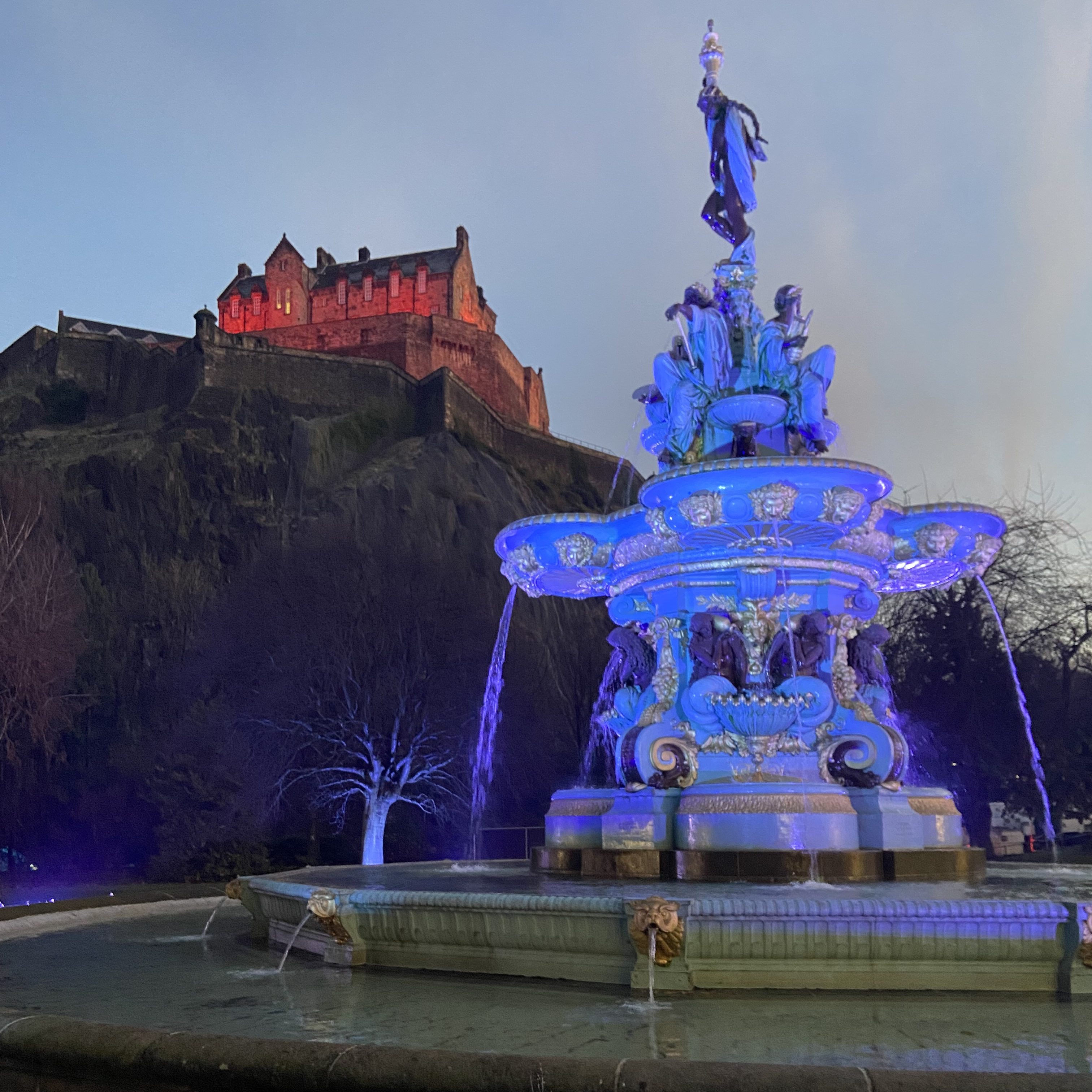 Descendo de Calton Hill, caminhei até o Scott Monument, um dos marcos mais imponentes e centrais de Edimburgo. Essa torre gótica, dedicada ao escritor escocês Sir Walter Scott, tem 287 degraus que levam a uma vista incrível da cidade. A subida custa cerca de £8 e pode ser comprada no local, e apesar de ser estreita e um pouco claustrofóbica, vale a pena para quem quer um ângulo único da cidade! Logo ao lado está o Princes Street Gardens, um parque lindo e bem cuidado, que estava abrigando o maior mercado de Natal da cidade. É perfeito para um passeio relaxante. Ali, parei para admirar a Ross Fountain, uma fonte vitoriana restaurada que contrasta lindamente com o castelo ao fundo.