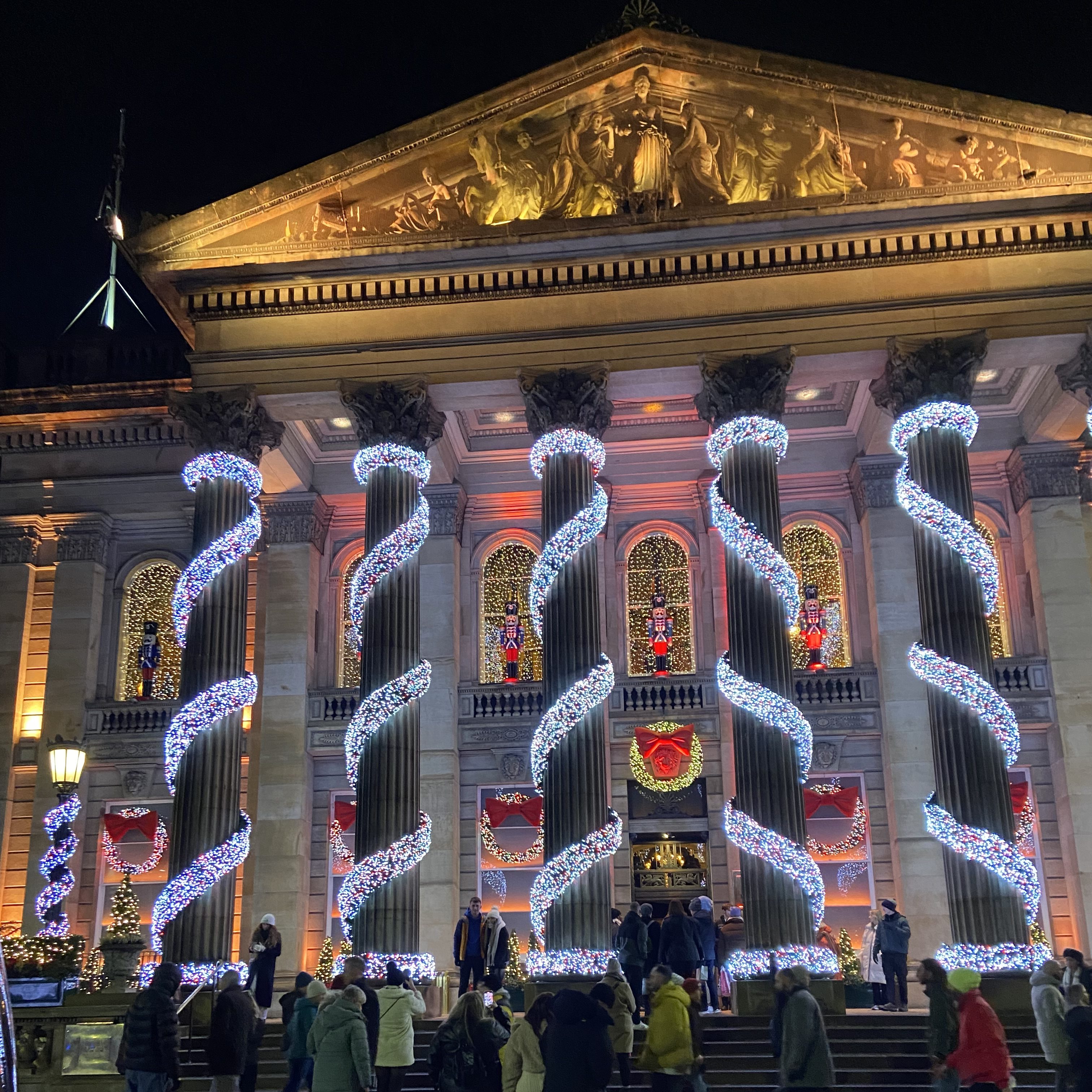 Descendo pela histórica Lawnmarket, passei pelo Assembly Hall, um edifício elegante que recebe eventos importantes, incluindo parte do famoso Festival de Edimburgo. Continuei andando até chegar a The Mound, uma colina artificial que conecta a Cidade Velha à Cidade Nova. O local é perfeito para tirar fotos, especialmente com o Scott Monument e a galeria de arte ao fundo. A mistura entre os edifícios históricos e a vista das colinas ao redor da cidade torna esse trecho da caminhada ainda mais especial. E para fechar o dia com chave de ouro, escolhi jantar no The Dome, um dos restaurantes mais sofisticados e bonitos da cidade. Instalado em um antigo banco, o restaurante tem uma decoração luxuosa, com colunas imponentes e um impressionante teto de vidro. Como visitei na época de natal, a decoração estava incrível e a comida estava excelente, e o ambiente elegante fez com que a noite fosse ainda mais memorável. O lugar costuma ser bastante procurado, reserve com antecedência. Foi o final perfeito para um dia inesquecível em Edimburgo.