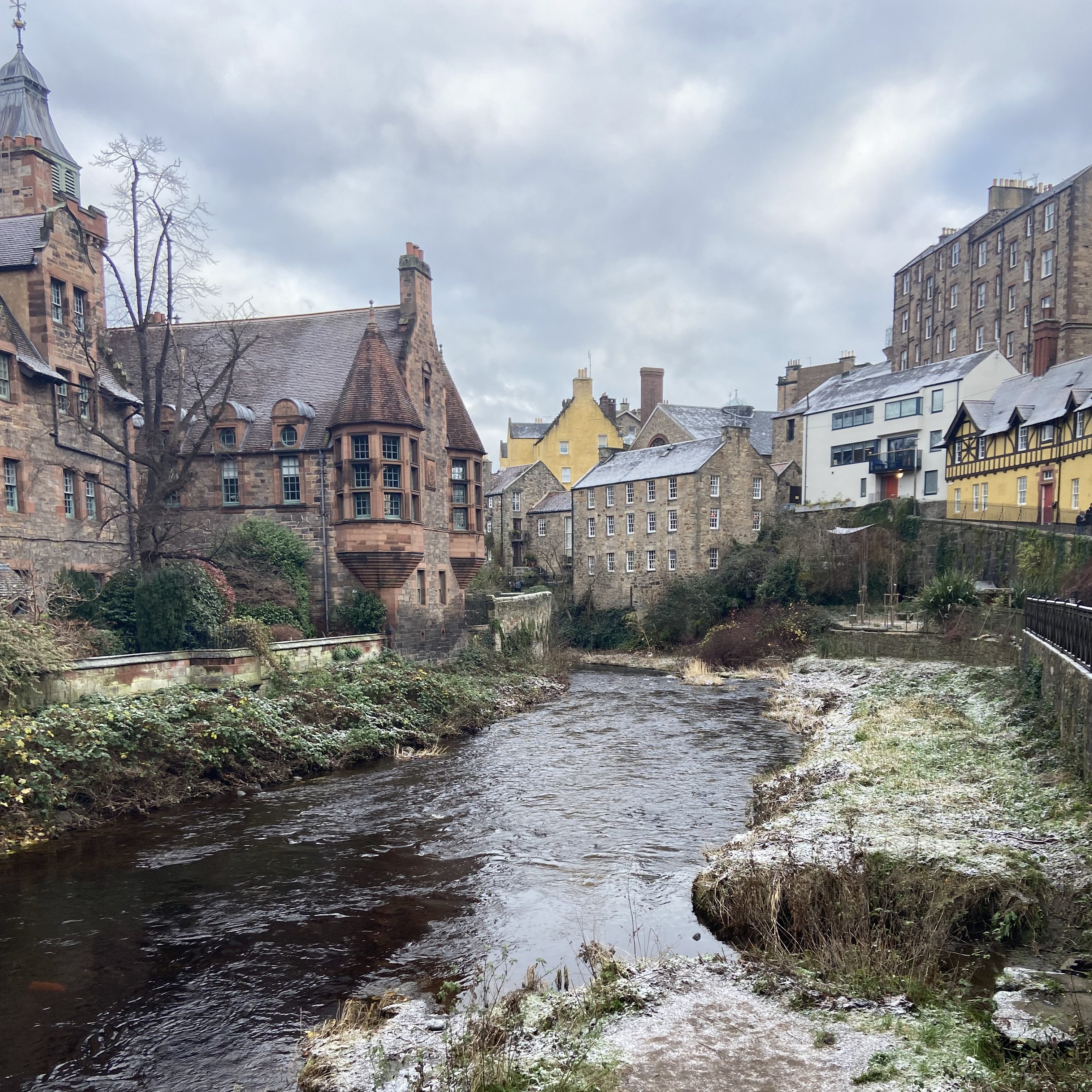 Depois atravessei para a New Town, senti o contraste entre a parte medieval e a Edimburgo mais elegante, com ruas largas e arquitetura georgiana. Um dos lugares mais fotogênicos é a Circus Lane, uma ruazinha estreita e charmosa, com casas de pedra cobertas de plantas e um clima quase de vilarejo. Seguindo um pouco mais, cheguei a Dean Village, que é um dos lugares mais encantadores de Edimburgo, um antigo vilarejo de moinhos às margens do rio Water of Leith, a apenas 10 minutos de caminhada do centro. Com suas casas de pedra históricas, pontes charmosas e um ambiente tranquilo, parece um refúgio escondido dentro da cidade. Antigamente, era uma área industrial com mais de 11 moinhos funcionando, mas hoje é um dos bairros mais pitorescos e fotogênicos da capital escocesa. Caminhar por suas ruelas estreitas, cruzar a icônica Well Court e ouvir o som do rio tornam a visita uma experiência quase mágica, perfeita para quem quer fugir do agito e descobrir um lado mais calmo e bucólico de Edimburgo.