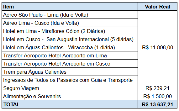 Esses são os valores que paguei de acordo com cambio a época (agosto de 2024): uma média de 1 PEN = R$ 1,30. Se for comprar dinheiro físico, opte pelos câmbios na cidade, e evite os câmbios do aeroporto ou do Brasil, pois a conversão é mais cara. Também é possível usar dólar, então o dinheiro físico é mais para levar nos passeios onde pode não haver sinal de celular os máquinas de cartão de crédito. Dica: Leve dólar e troque nas casas de câmbio lá pelo Sol Peruano – a conversão do dólar é mais vantajosa.