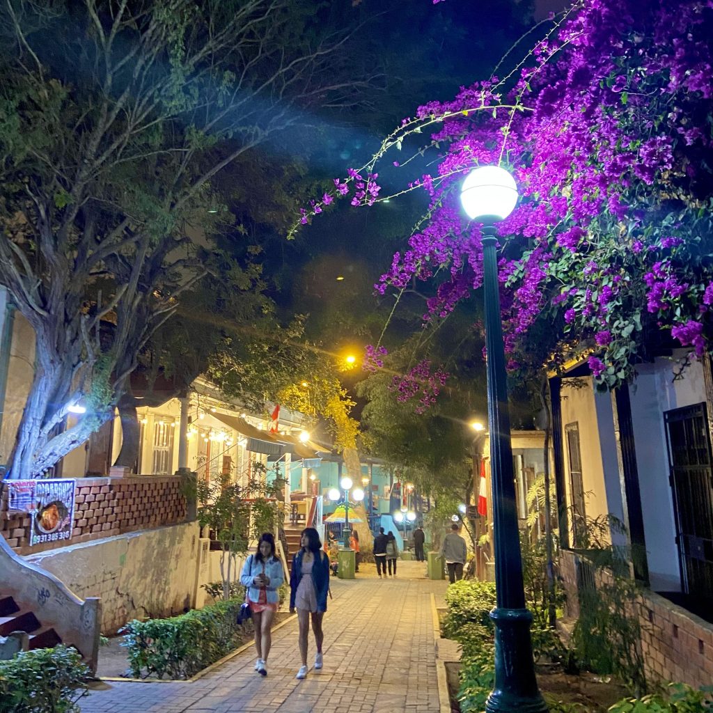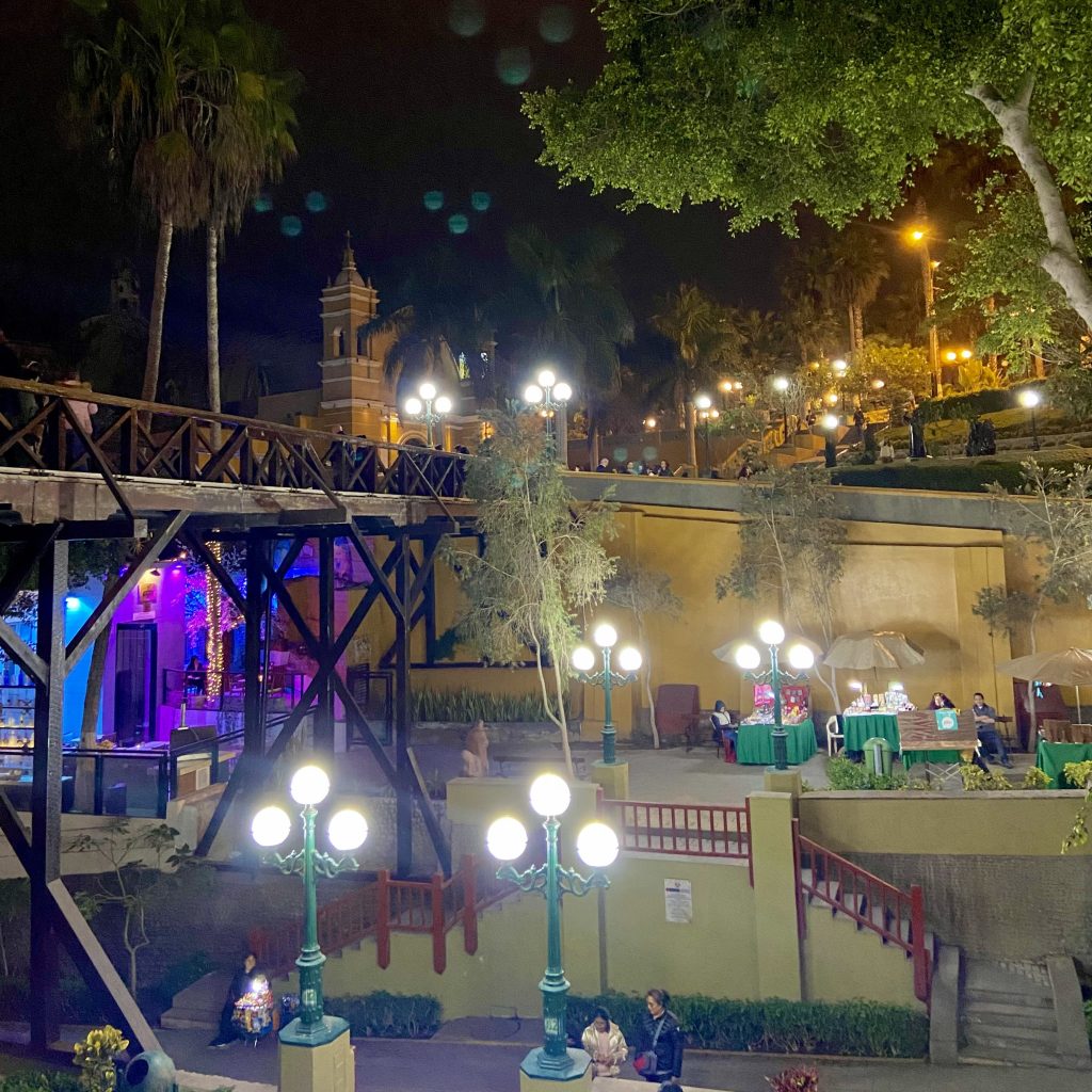 À noite, peguei um Uber e fui para o bairro Barranco, que tem uma vibe totalmente diferente de Miraflores. Conhecido como o bairro boêmio de Lima, Barranco é repleto de arte, música e uma energia jovem e descontraída. Fui direto para a Plaza de Barranco, onde se mistura a arquitetura colonial com murais de arte urbana. Aproveitei para dar uma olhada nas galerias de arte e me perder pelas ruelas coloridas, até chegar ao icônico Puente de los Suspiros, considerado um dos pontos mais românticos da cidade. A vista do lugar, especialmente à noite, é simplesmente encantadora, com as luzes da cidade mudando totalmente o mood.