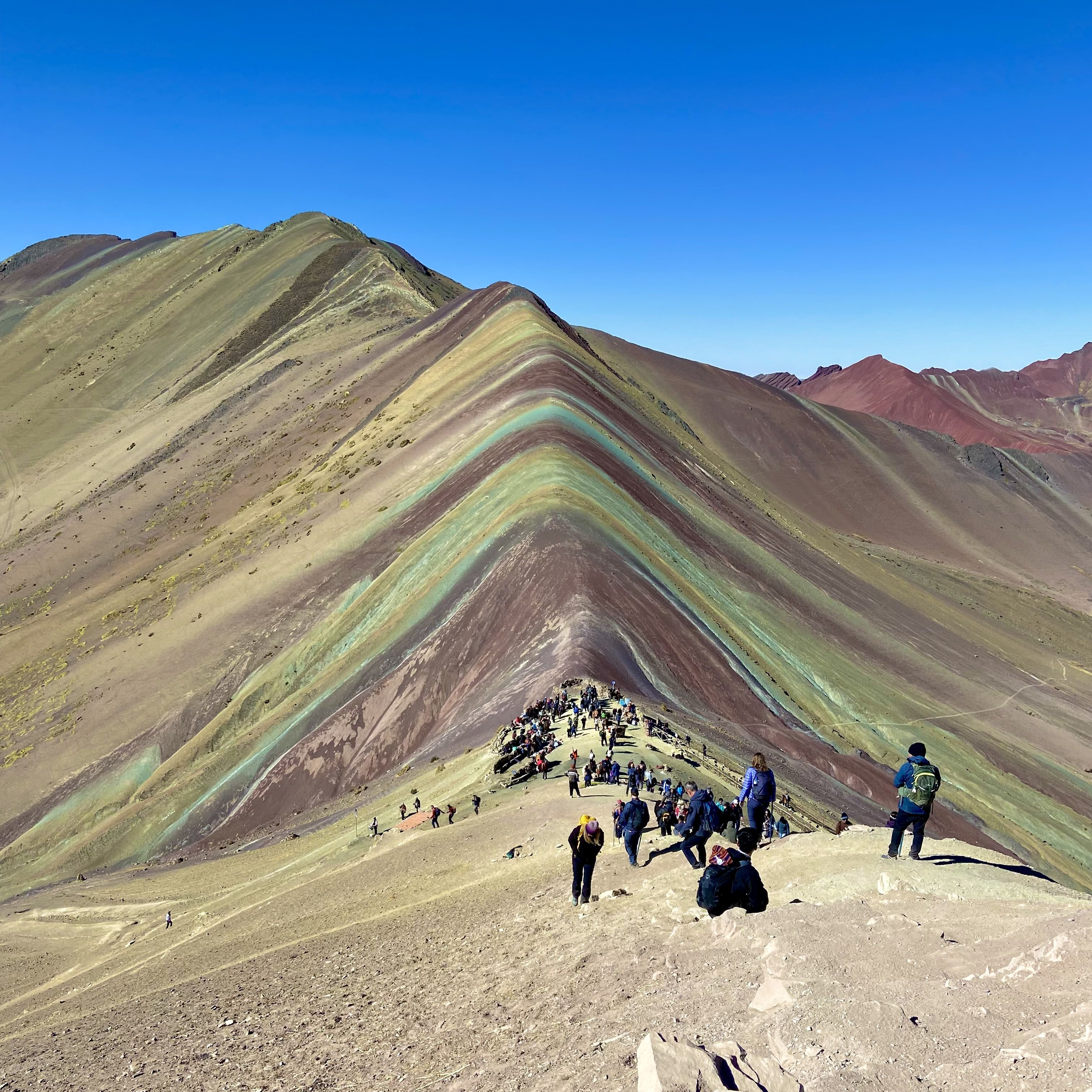 Chegando ao início da trilha, existem algumas opções: subir e descer a pé, subir de cavalo até a base do pico da montanha e descer a pé (na minha opinião essa opção não compensa, porque a pior parte da trilha é no final, e o cavalo não sobe), ou subir de moto até o ponto mais alto possível de subir com transporte e descer a pé (também dá pra descer de moto se quiser). Eu optei por subir de moto e descer a pé, paguei 70 soles a mais, não me arrependo de nada, pois a subida é conhecida por ser desafiadora devido à altitude (a montanha fica a cerca de 5.200 metros acima do nível do mar) e a moto te deixa de cara com a montanha, você só cansa se quiser gastar mais uns 5 minutinhos a pé e subir no pico pra ver melhor a montanha colorida (e vale a pena para as melhores fotos). A incrível coloração das montanhas é resultado de uma combinação de minerais e erosão ao longo do tempo, criando as faixas coloridas que fazem o local ser tão único e impressionante. As cores variam entre tons de vermelho, rosa, verde, amarelo e até azul, proporcionando uma paleta natural de cores vibrantes que não se vê em muitos outros lugares do mundo. Sem dúvida a visibilidade das cores fica em melhor em dia de sol. Mesmo com a dificuldade da altitude, a visão da Montanha Colorida compensa. Passei um tempo admirando a paisagem e, depois desci a pé de volta à van (muito mais tranquilo o trajeto de descida), e nessa hora me emocionei com a paisagem e pensando na experiência que eu estava vivendo.