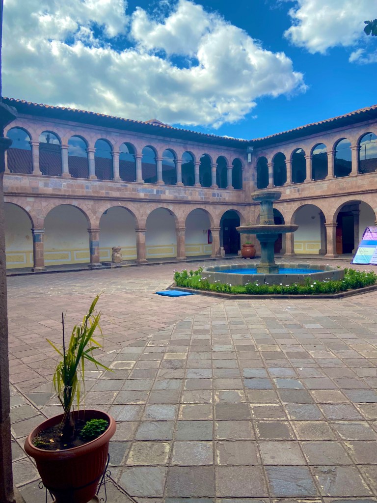 À tarde, comecei minha exploração de Cusco, começando pelo Qorikancha (Templo do Sol), um dos sítios mais importantes do Império Inca. Originalmente, esse templo era coberto de folhas de ouro, e seu nome significa “muro de ouro” em quechua. Durante o Império Inca, era o centro religioso mais importante, dedicado ao deus sol Inti. Quando os espanhóis chegaram, construíram a Igreja de Santo Domingo sobre as ruínas do Qorikancha, e hoje é fascinante ver a combinação da arquitetura inca com a colonial.
