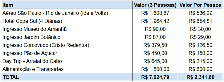 Abaixo está listado os valores que pagamos nessa viagem para o Rio de Janeiro em julho de 2024. Como viajei com dois amigos, os custos de hotel e transporte na cidade ficam mais diluídos: