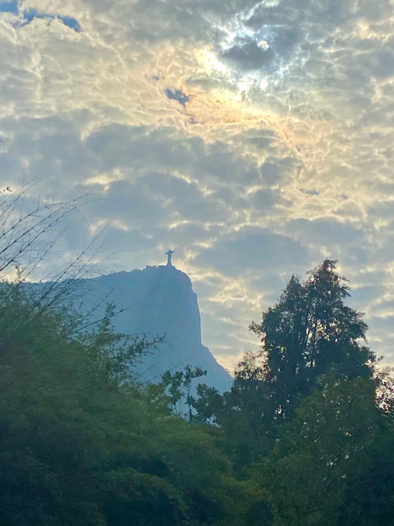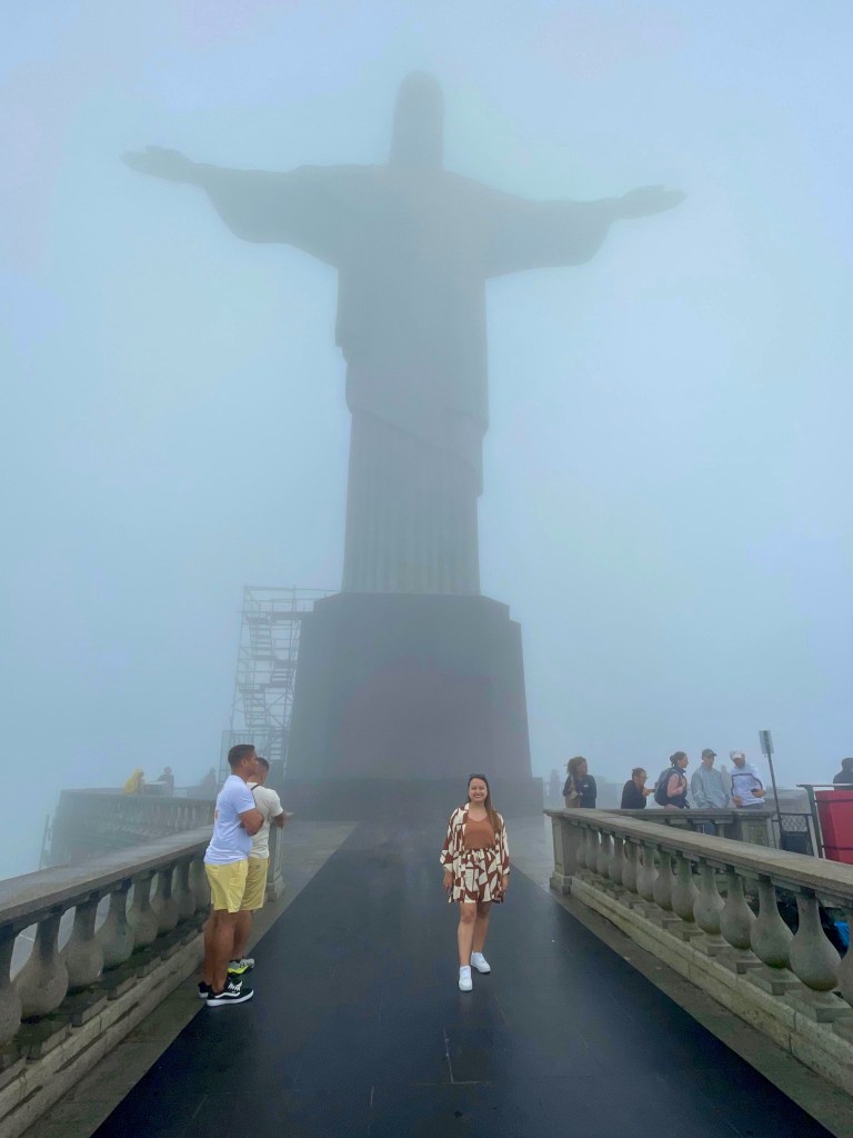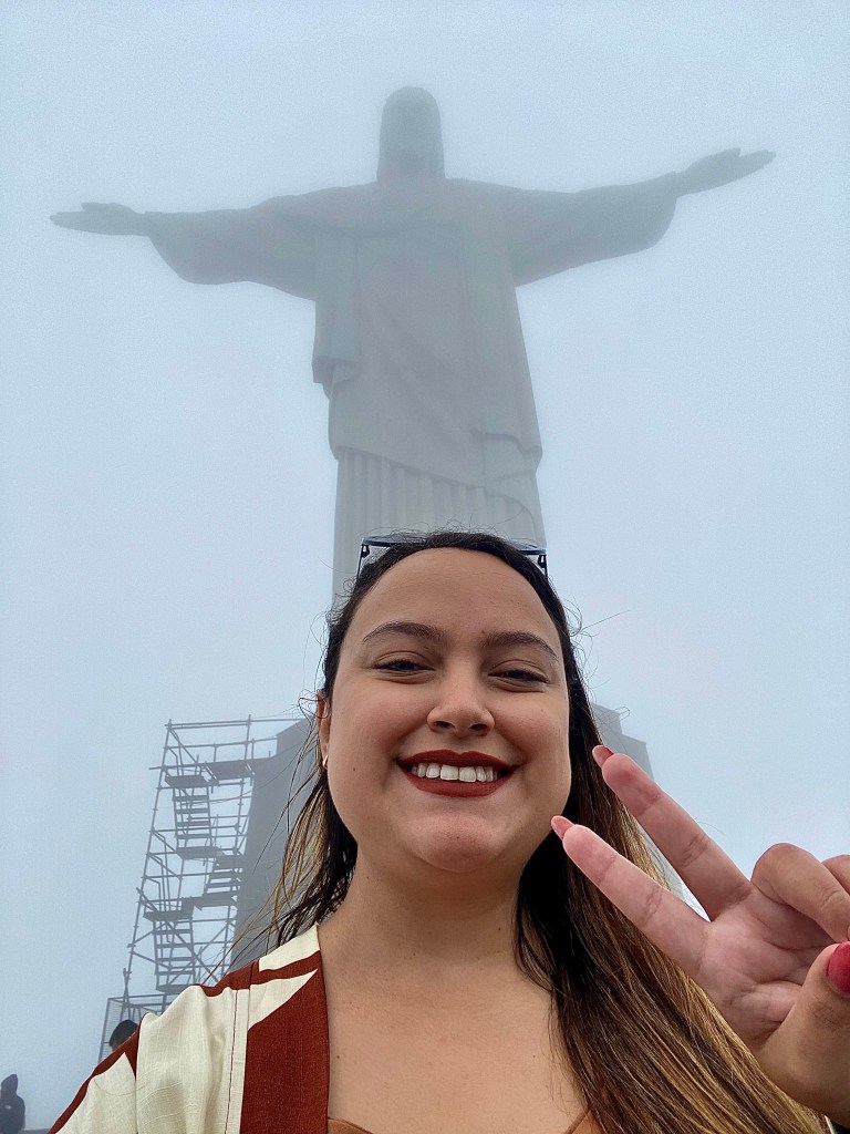 Esse foi o dia mais turístico da viagem e acordamos com a maior neblina na cidade. O primeiro destino do dia era um dos momentos mais esperados da viagem para mim: visitar o Cristo Redentor. Ele fica no topo do Morro do Corcovado, a 710 metros de altura, abraçando a cidade inteira — e a sensação é realmente essa, de ser acolhida. Mesmo que você já tenha visto mil fotos, estar ali, ao vivo, é outra coisa. Pegamos a primeira van da manhã, mas como a cidade estava com neblina, o Cristo estava sem visibilidade (ou seja, vou ter que voltar em um dia de sol para ver a vista da cidade de lá de cima). Mas como não teríamos outra oportunidade na viagem, subimos mesmo assim e pelo menos deu pra ver o Cristo de pertinho, é emocionante, não é a toa que é uma das Sete Maravilhas do Mundo Moderno. Existem algumas opções de como subir para o Cristo, nós escolhemos ir com a van oficial, que sai de três pontos diferentes: Copacabana (Praça do Lido), Largo do Machado e Paineiras Corcovado. As vans são credenciadas pelo Parque Nacional da Tijuca e já incluem o ingresso para acesso ao monumento. O percurso é confortável, com ar-condicionado e sem perrengue. Dá pra comprar antecipado pelo site oficial do Cristo Redentor, o que eu recomendo fortemente pra evitar filas. O valor do pacote completo (transporte + ingresso) custa R$ 130 por pessoa (adulto – preço de abril/2025), dependendo do ponto de partida.