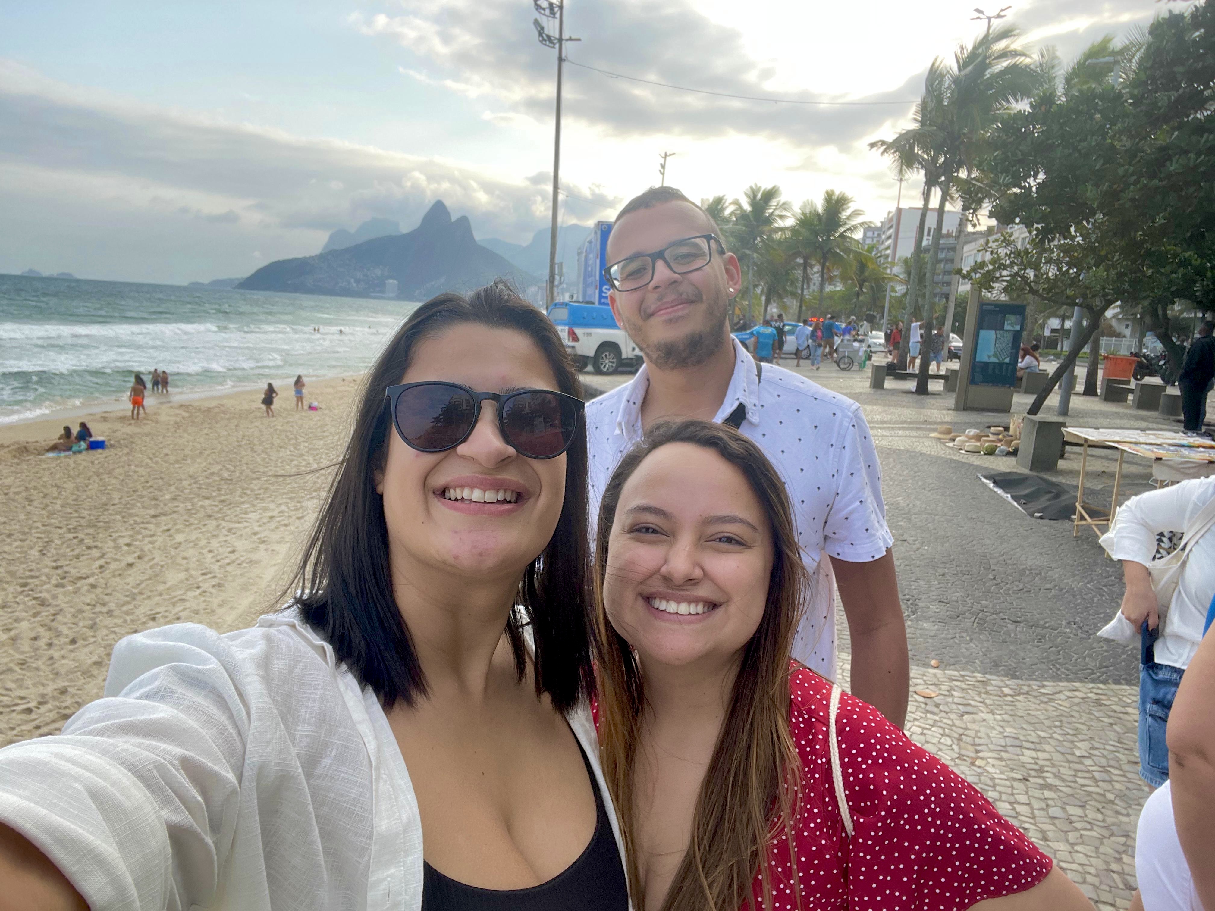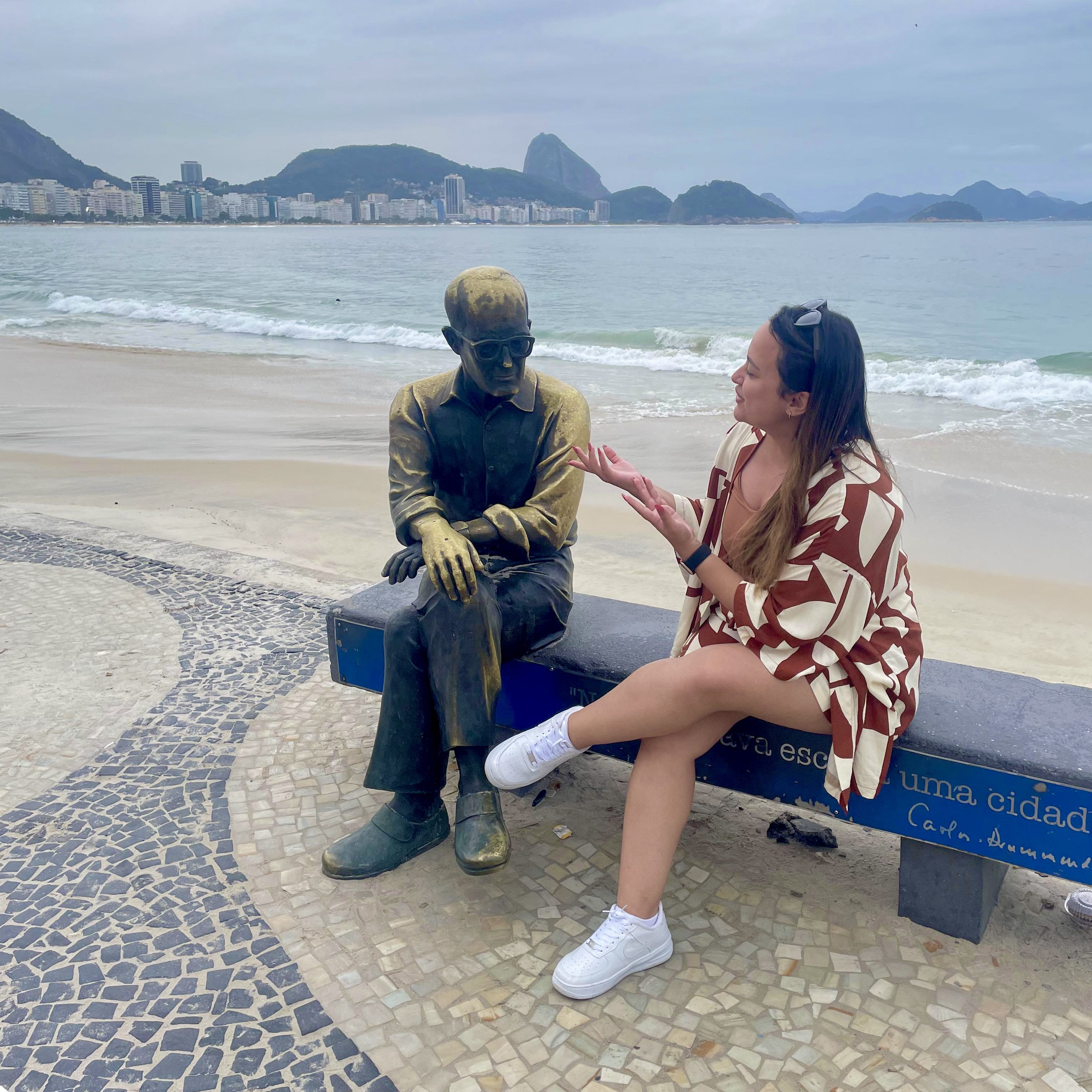 E no final da tarde, decidimos tomar um café pelos arredores do hotel e depois passamos pela orla da Praia de Copacabana. Ali no canto direito da praia tem a estátua do Carlos Drummond de Andrade, sentado em um banco, observando o mar com cara de quem acabou de escrever um poema. É uma delícia caminhar pelo calçadão sentindo a energia local, mas tome cuidado com seus pertences pessoais, evite circular com colares ou coisas de valor que podem ser facilmente puxadas.