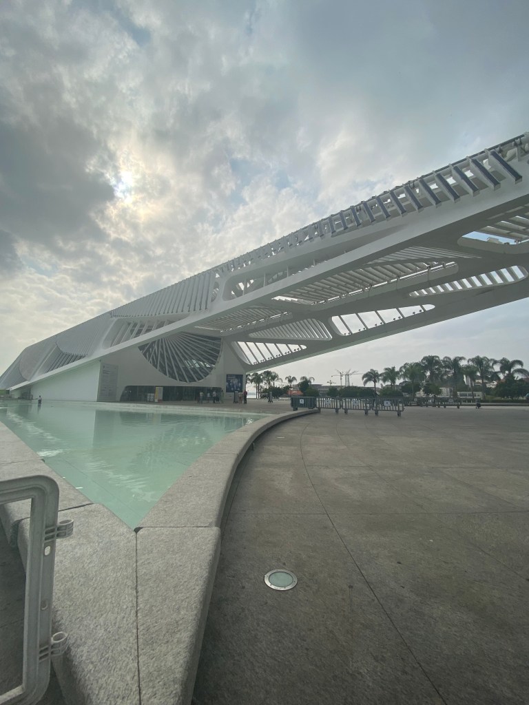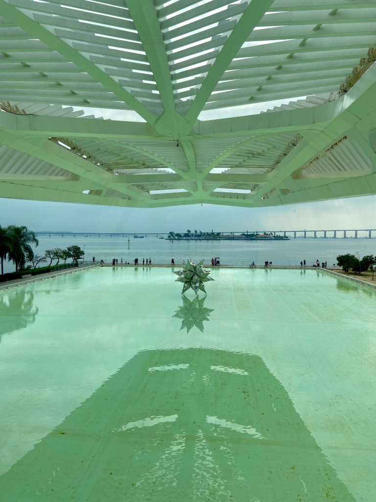 Nosso primeiro dia no Rio foi intenso. Como chegamos cedo, nosso quarto no hotel ainda não estava liberado. Então deixamos as malas na recepção e partirmos para o primeiro destino do dia: começamos pelo Museu do Amanhã, um prédio moderno, de arquitetura futurista, que parece uma nave espacial pousada bem na beira da Baía de Guanabara. Por fora já impressiona, mas por dentro é ainda mais especial: o museu propõe reflexões sobre o futuro do planeta e da humanidade, com experiências interativas, instalações visuais e informações sobre mudanças climáticas, inteligência artificial, biodiversidade e o impacto das nossas escolhas. É aquele tipo de passeio que faz a gente pensar. O ingresso custa R$30 (inteira). Dá pra comprar antecipado pelo site oficial — recomendo, porque pode ter fila. Reserve pelo menos uma hora para explorar tudo com calma.