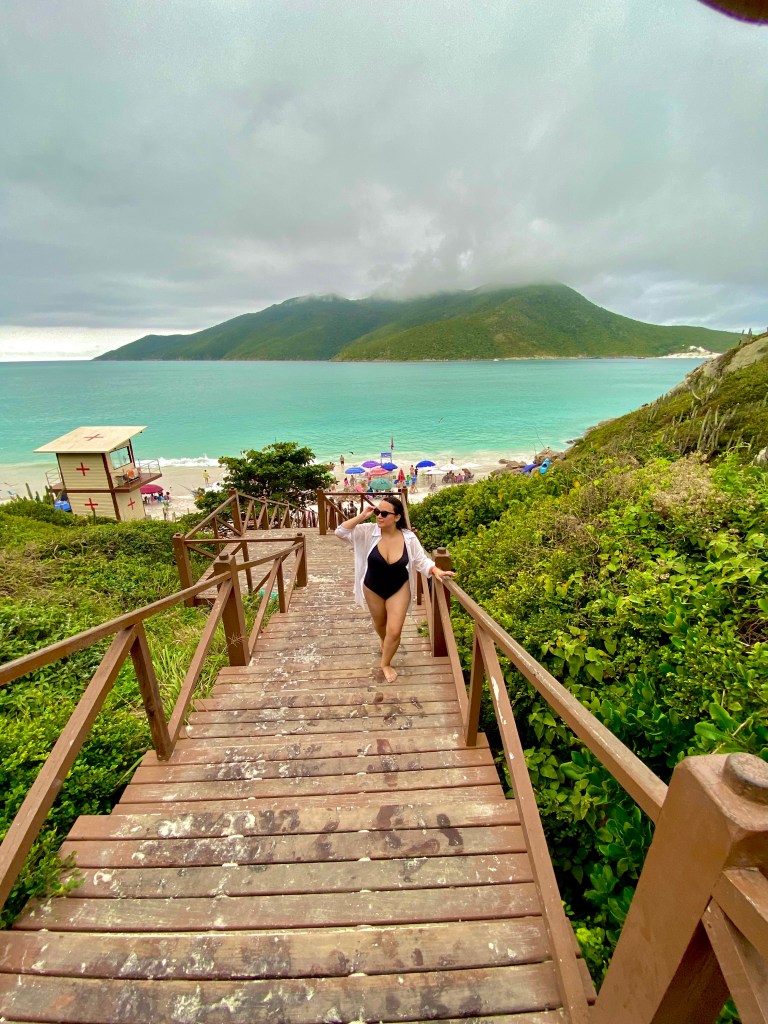 O roteiro começou pelas Prainhas do Pontal do Atalaia, onde ficam a famosa escadaria de madeira e a Gruta do Amor. A parada aqui durou cerca de 45 minutos e foi uma das minhas favoritas! A praia é mais escondida, cercada por morros, e com mar supertranquilo e muito azul, de águas cristalinas. Mesmo no dia nublado as cores saltavam. A vista da escadaria é surreal e de fato, vale muito a pena.
