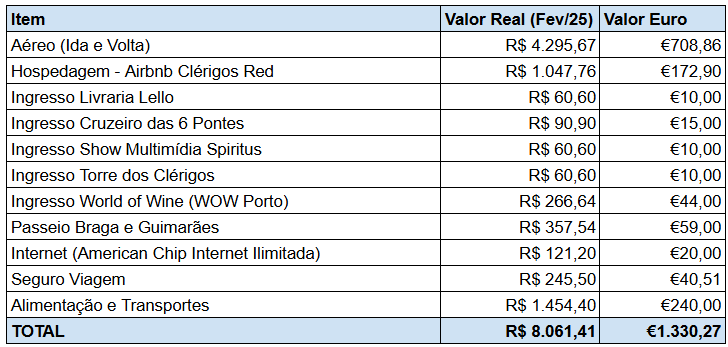 Abaixo está listado os custos que eu paguei pela viagem para Porto, em fevereiro de 2025, com câmbio € 1 = R$ 6,06.