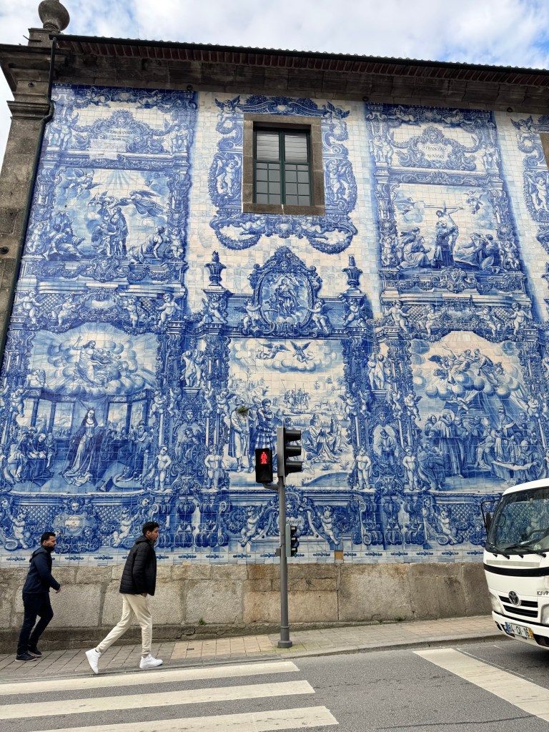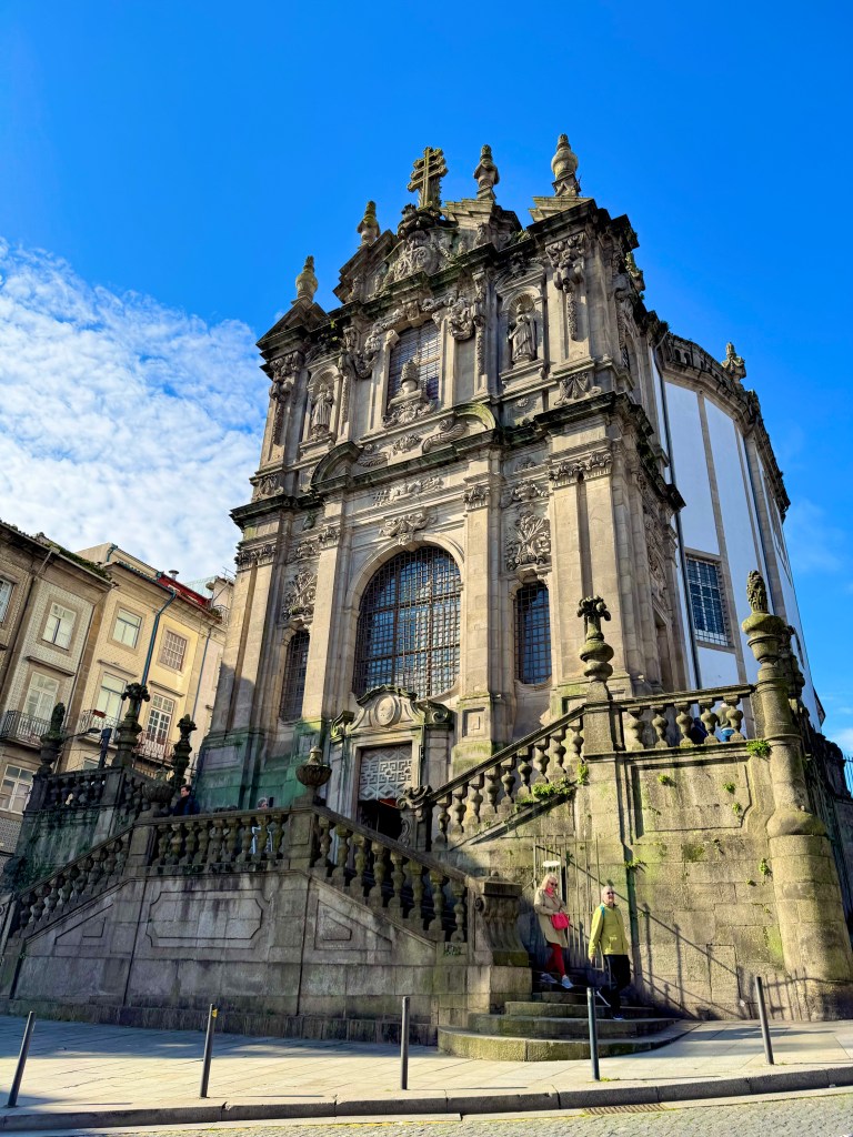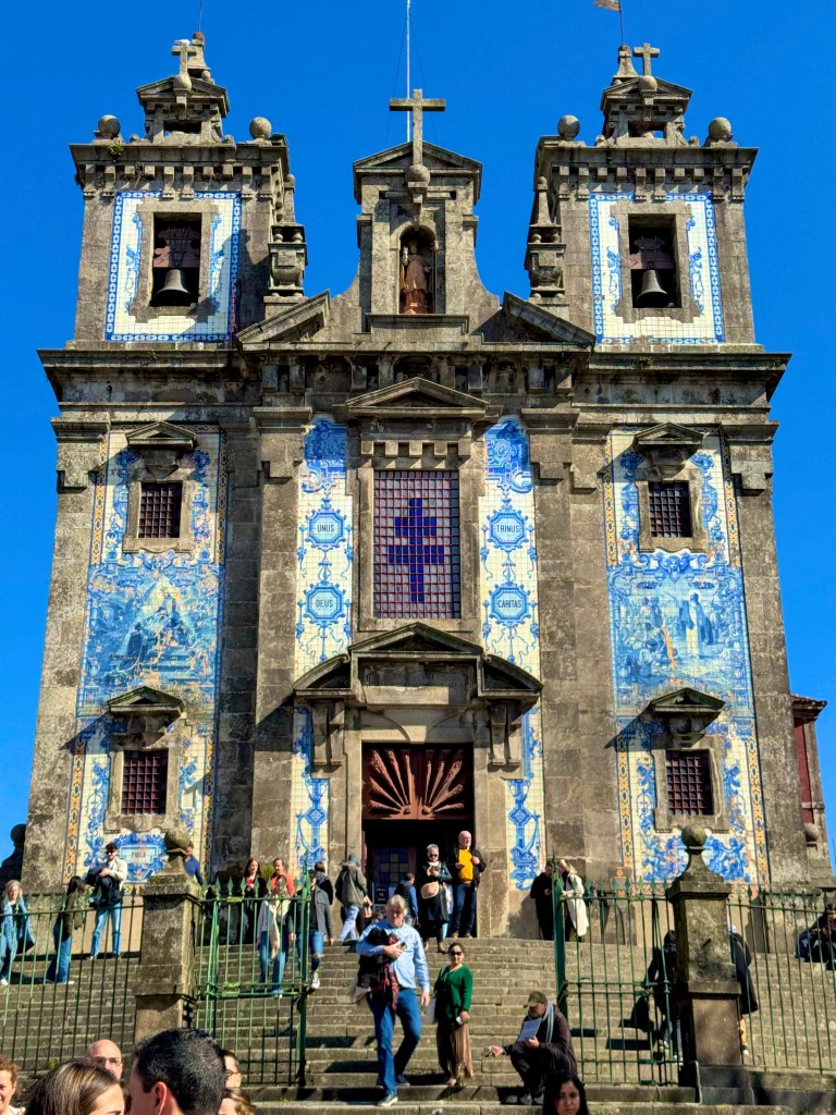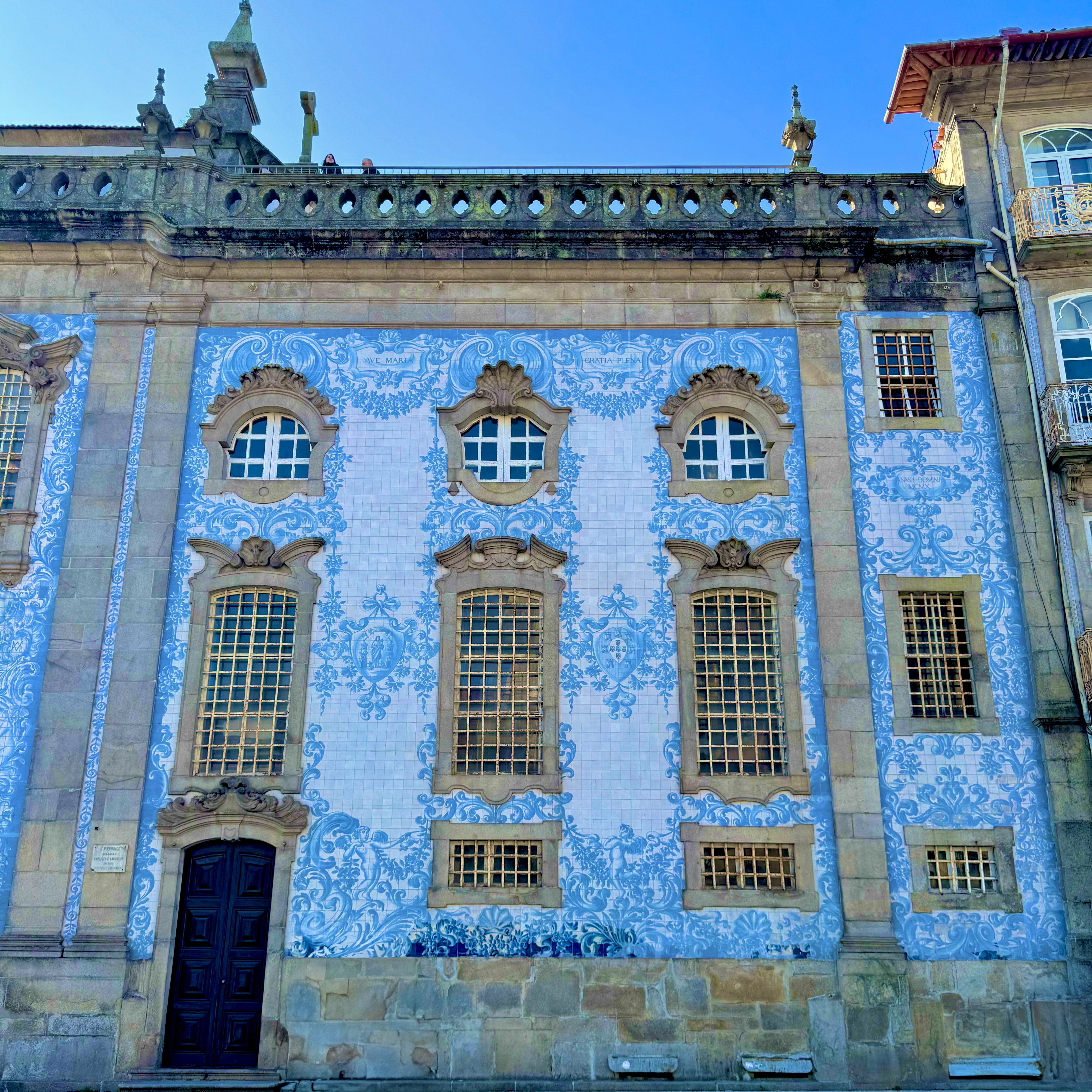 Ali em frente à Lello tem uma galeria charmosa com lojinhas e cafés, e uma praça com restaurantes e bares que têm vista para a Torre dos Clérigos — um ótimo lugar pra dar uma pausa, tomar uma cervejinha e observar o vai e vem da cidade. Essa região tem um astral muito gostoso. Segui para a belíssima Universidade do Porto, que fica ali pertinho – o prédio histórico é fotogênico e a praça em frente costuma ter estudantes, artistas de rua e gente curtindo o sol. Bem ao lado estão duas igrejas que parecem grudadas: a Igreja do Carmo e a Igreja das Carmelitas, separadas por uma casinha super estreita (que, dizem, foi construída pra evitar o contato direto entre monges e freiras). A lateral da Igreja do Carmo tem um painel de azulejos azul e branco que é um clássico de Porto. As igrejas foram construídas em épocas diferentes e têm estilos arquitetônicos distintos: uma mais sóbria e barroca e a outra no estilo rococó.