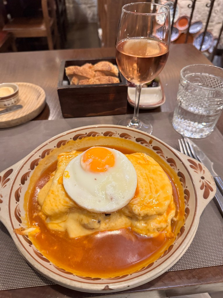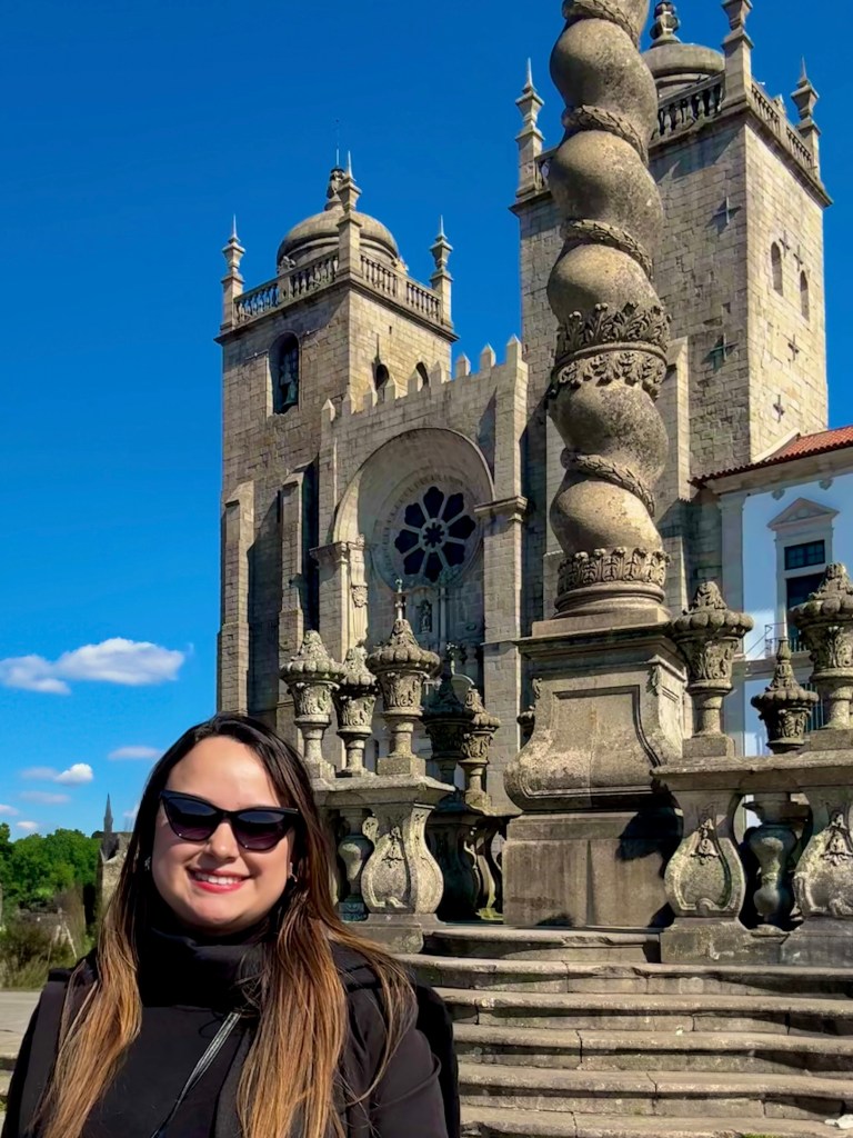 Antes de seguir para o próximo destino, fiz uma pausa estratégica para almoço no Brasão Coliseu, onde comi uma das melhores francesinhas da viagem. Esse é um prato típico português, parece um croque monsieur turbinado, coberto por uma camada generosa de queijo derretido, recheado de carne e linguiça e mergulhado num molho espesso, alaranjado e levemente picante, que transforma o prato num verdadeiro exagero delicioso à moda do Porto. Vá com fome! Depois fui caminhando até a Sé do Porto, a catedral mais antiga da cidade. Construída no século XII, ela é toda fortificada, parece quase um castelo! Do seu pátio, a vista é espetacular, especialmente ao entardecer. Dá pra visitar o claustro gótico e ver painéis de azulejos lindíssimos. A entrada no claustro é paga e custa 3€ (preço 2025), e o ingresso pode ser adquirido no site oficial.