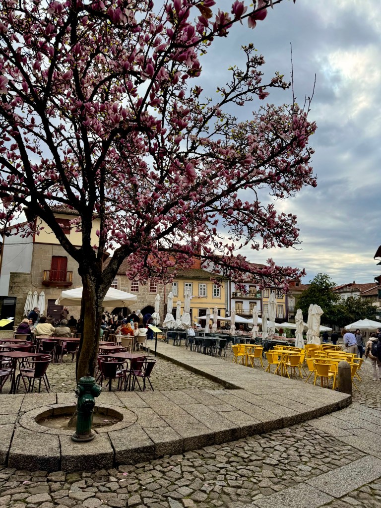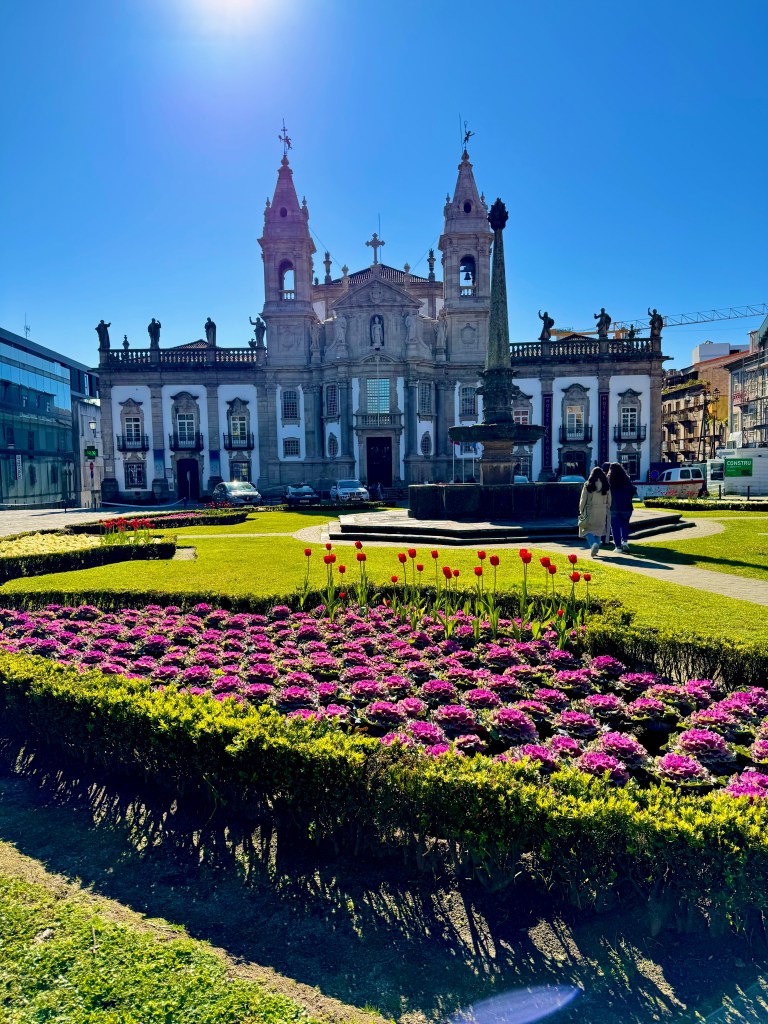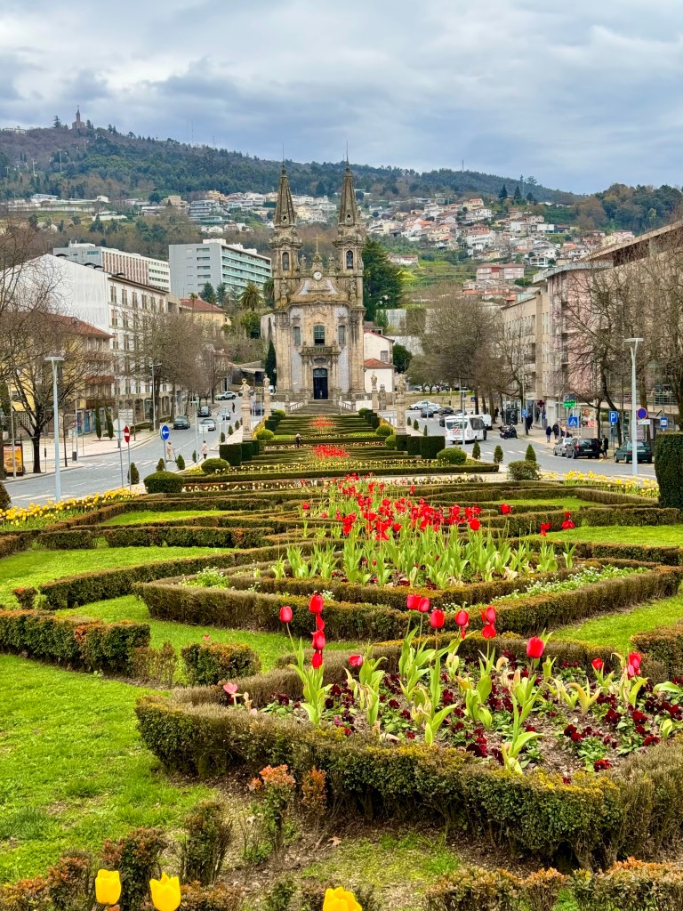 À tarde, seguimos para Guimarães, cidade que carrega com orgulho o título de “berço de Portugal”, por ter sido onde nasceu o primeiro rei do país. Começamos pelo Castelo de Guimarães, que parece saído de um livro de fantasia. Foi erguido no século X como fortaleza contra invasões mouras e normandas. Diz a tradição que ali viveu D. Afonso Henriques durante sua infância. A vista das muralhas é linda, e andar por ali te faz imaginar como eram as coisas naquela época. Na sequência, tivemos uma visita guiada pelo centro histórico — e que lugar encantador! As construções são super bem preservadas, com varandas floridas, escudos nas fachadas e ruas de pedra. A cidade é tombada pela UNESCO e tem um clima acolhedor que convida a se perder.