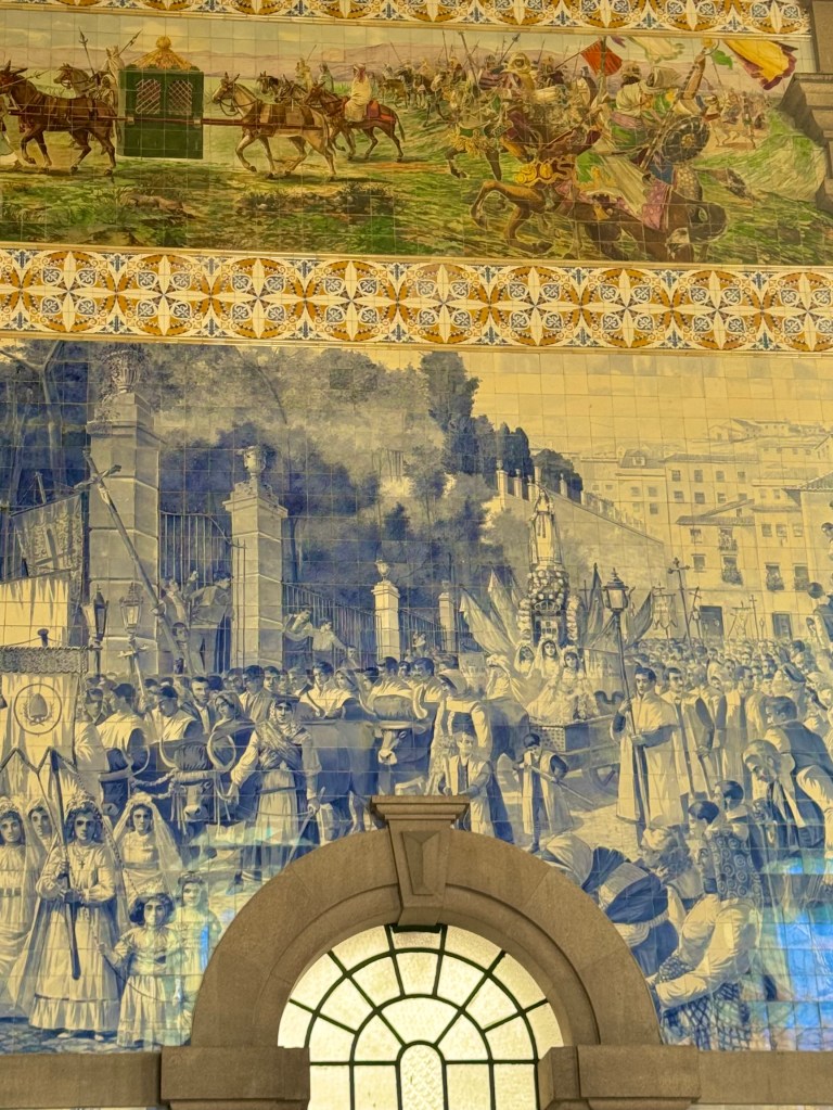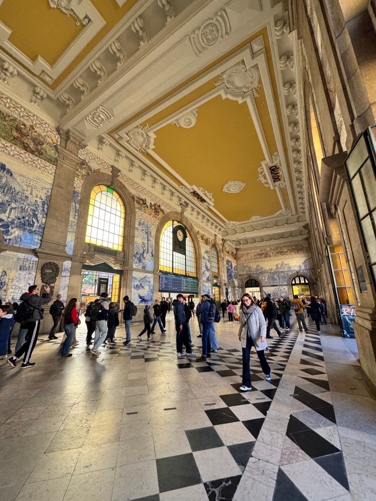 Antes de ir embora, ainda deu tempo de passar pela icônica Estação de São Bento. E olha… que estação! Mesmo que você não vá pegar trem nenhum, vale a visita. São mais de 20 mil azulejos pintados à mão, que retratam cenas da história de Portugal, desde batalhas medievais até a chegada do trem ao país. O contraste entre a arquitetura neoclássica da fachada e o interior todo azulejado é uma daquelas surpresas que só o Porto sabe oferecer. Dá vontade de ficar ali um tempão, só admirando os detalhes.