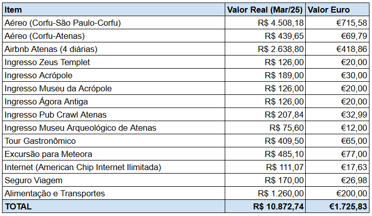 Abaixo está listado os custos que eu paguei pela viagem para Atenas, em junho de 2025, com câmbio € 1 = R$ 6,35.