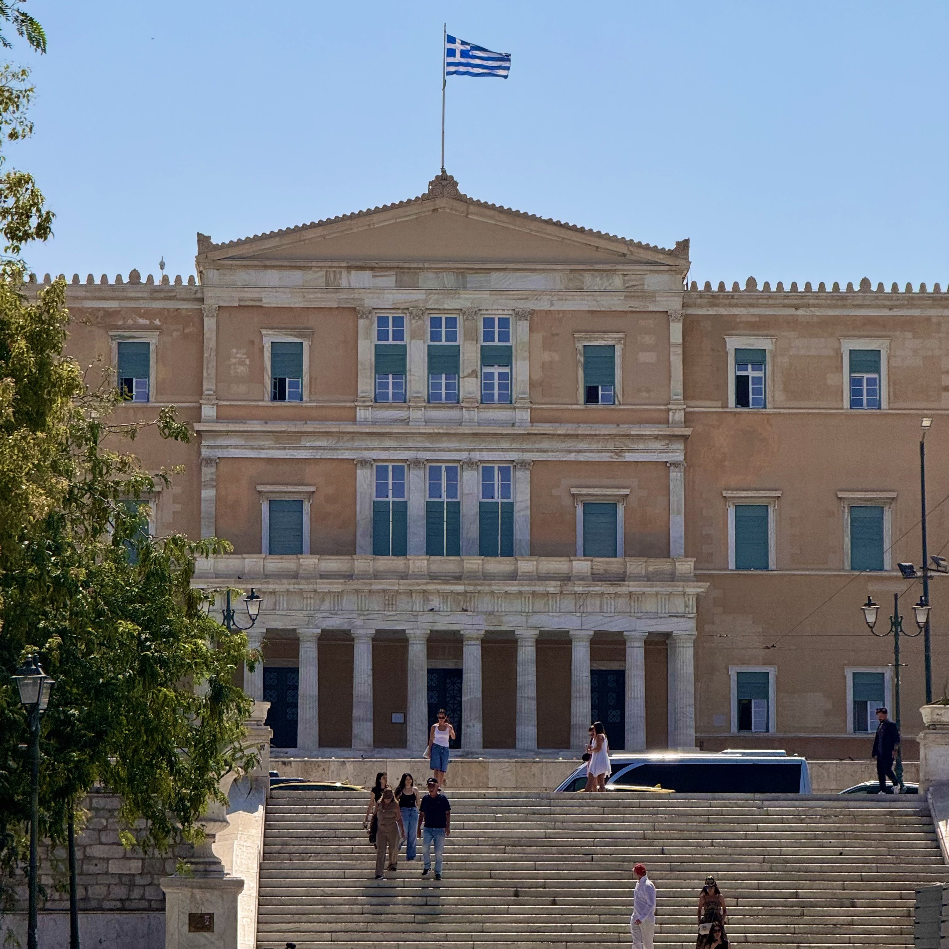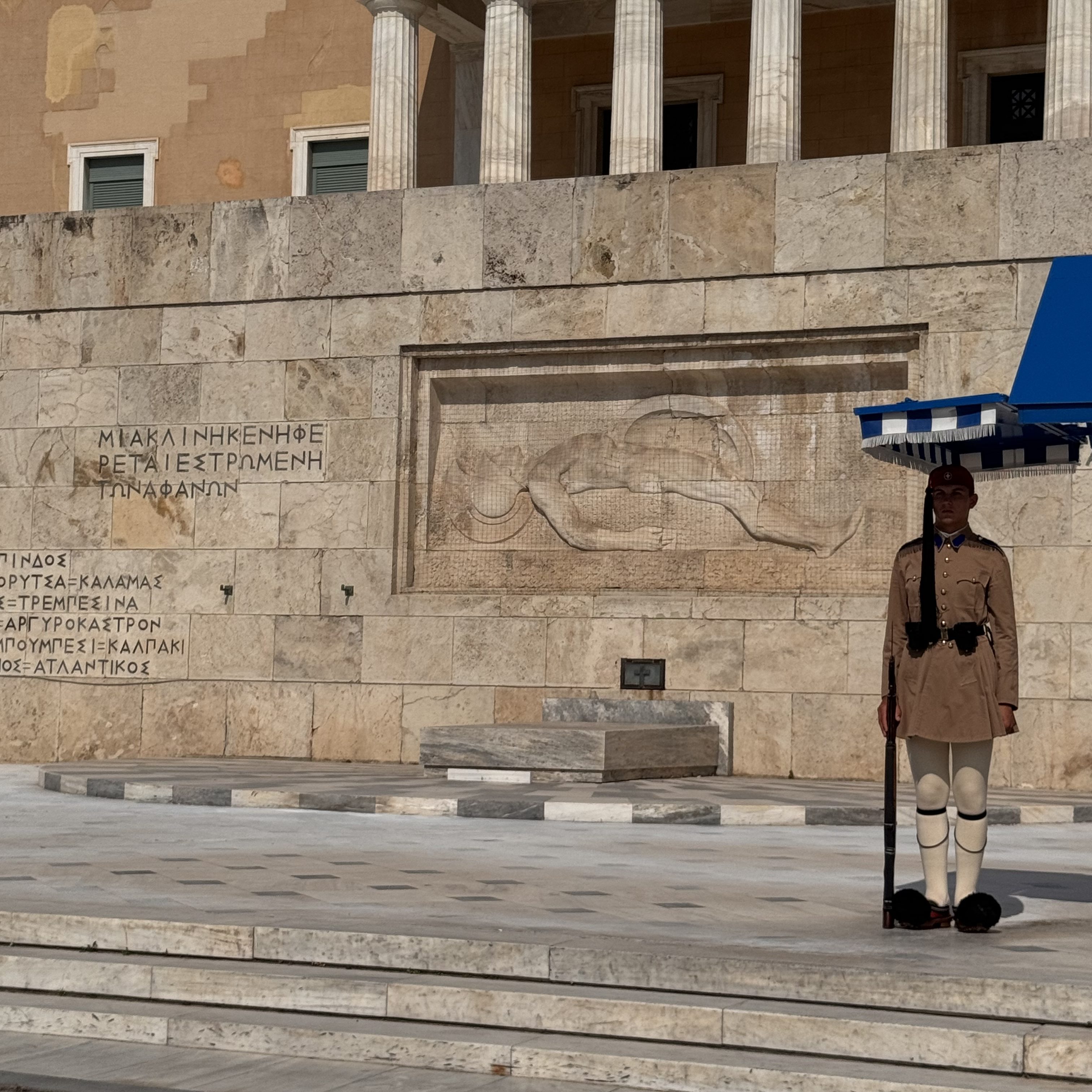 Como cheguei na cidade no meio da tarde, comecei explorando os arredores de onde meu Airbnb estava localizado. Comecei pela Praça Syntagma, o centro político e cívico de Atenas. É ali que fica o Parlamento Grego, um prédio imponente que já foi o antigo palácio real. Mas o que mais chama atenção são os soldados em frente ao Túmulo do Soldado Desconhecido. Eles ficam imóveis por longos períodos, vestidos com uniformes tradicionais dos Evzones: saias plissadas (chamadas fustanella), meias altas, coletes bordados e sapatos com pompons gigantes. A troca da guarda acontece a cada hora cheia e é um verdadeiro espetáculo: solene, lento, quase teatral. Fiquei ali um tempinho observando, intrigada com a coreografia e com o respeito silencioso dos turistas ao redor.
