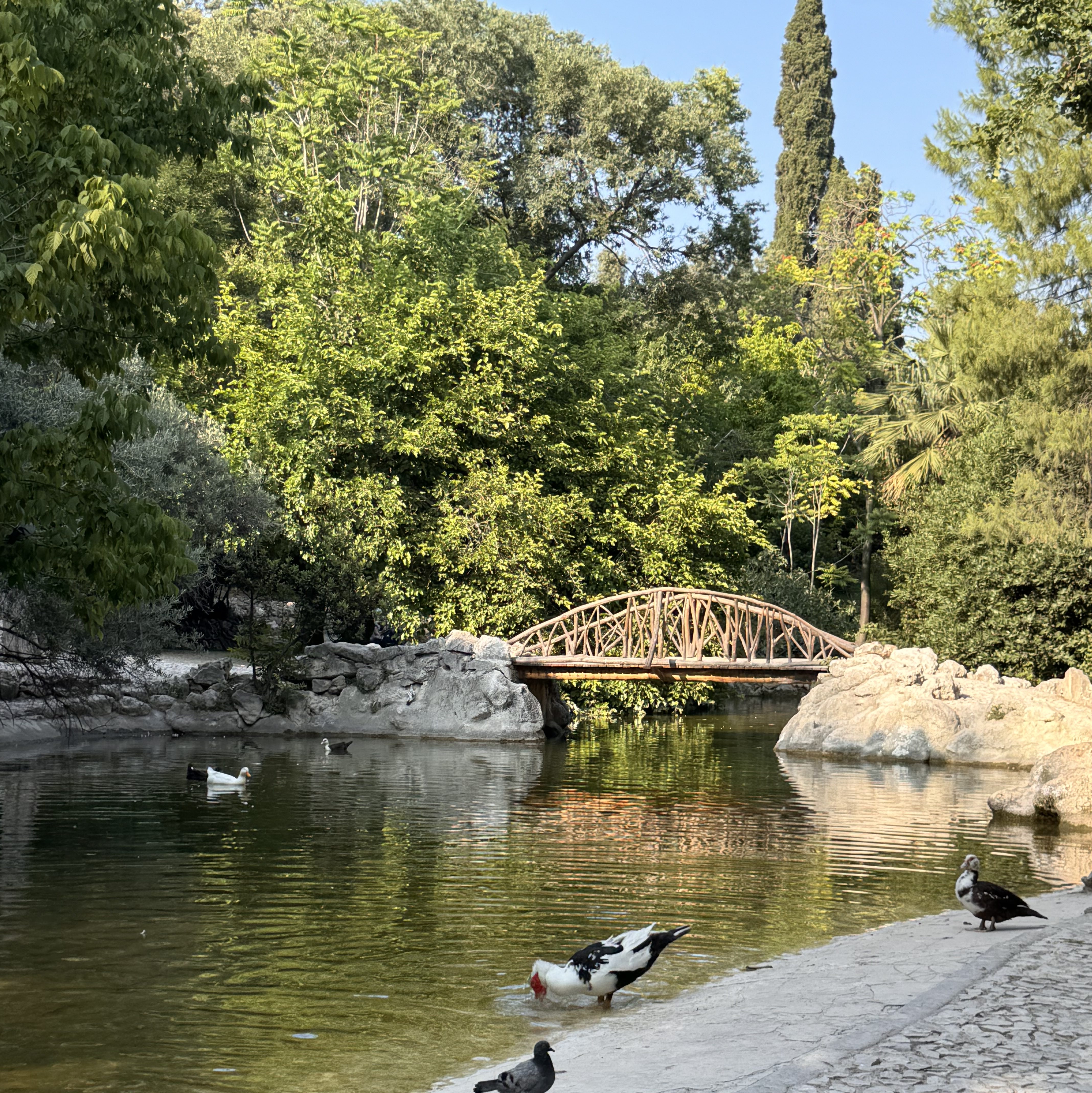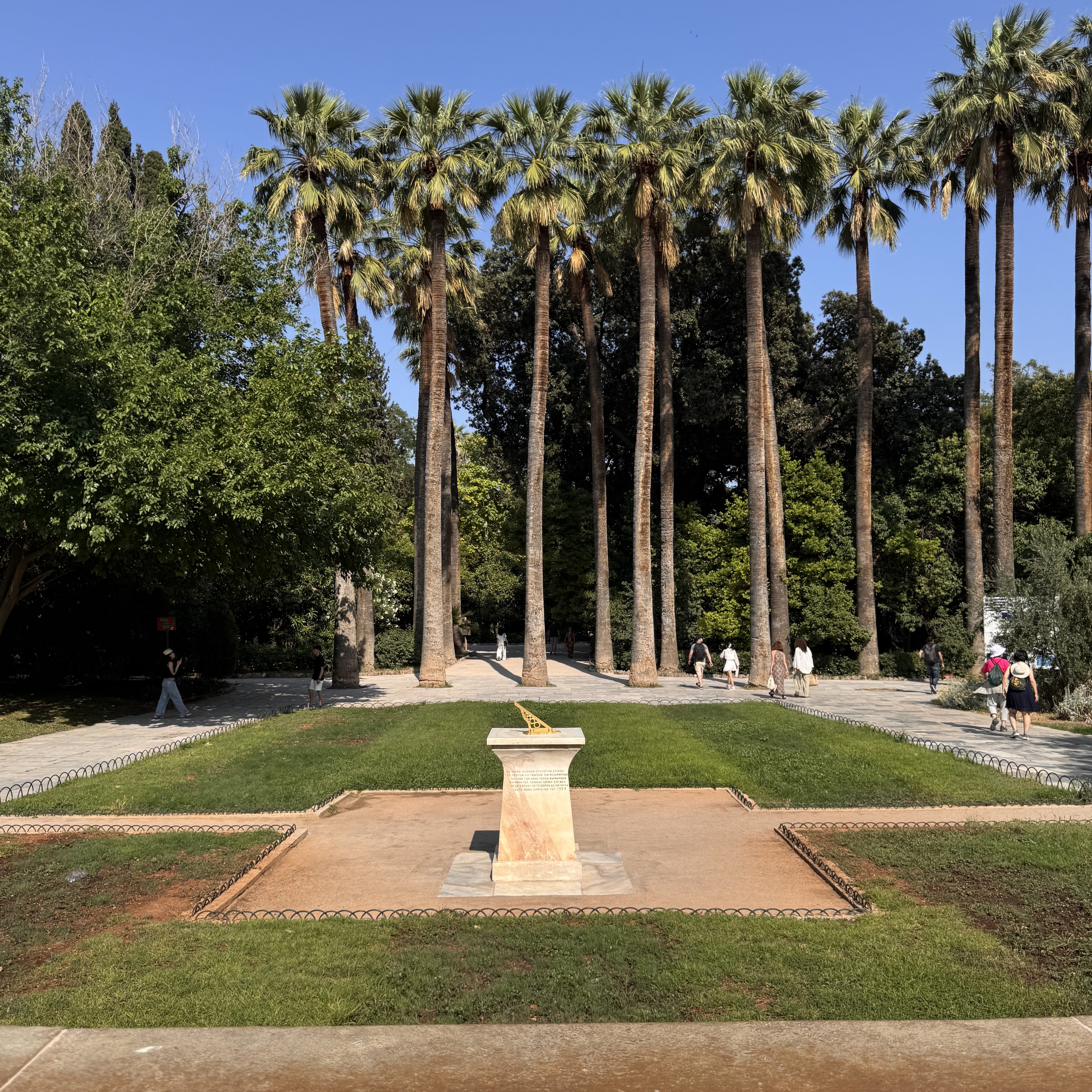 Dali, atravessei a rua e entrei no Athens National Garden, um verdadeiro refúgio no meio do caos da cidade. O contraste é imediato: do lado de fora, buzinas e movimento; ali dentro, só o som das folhas, passarinhos e fontes d’água. É um verdadeiro refúgio verde no coração da cidade, com quase 16 hectares de sombra, história e tranquilidade. Criado no século XIX por ordem da Rainha Amalia, o jardim abriga mais de 500 espécies de plantas do mundo todo, lagos com tartarugas e peixes, um pequeno zoológico com pavões soltos e coelhos, e caminhos rodeados por palmeiras altíssimas. Pelo caminho, dá pra encontrar ruínas antigas, fragmentos de colunas romanas, bustos de figuras históricas gregas e até um piso de mosaico da época romana preservado. O parque também tem uma biblioteca infantil, um playground, uma charmosa estufa histórica e até um pequeno Museu Botânico escondido entre as árvores. É o tipo de lugar que mistura natureza com cultura e que te convida a desacelerar — caminhar por ali foi como apertar um botão de pausa em meio à energia caótica e vibrante de Atenas. A entrada é gratuita. Um lugar perfeito pra pausar, respirar e se perder sem pressa.