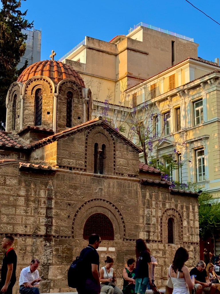 Comecei o dia um pouco mais tarde, matando a ressaca da noite anterior, explorando Monastiraki, uma das áreas mais vibrantes e históricas de Atenas. A praça é um verdadeiro mercado a céu aberto, repleto de vendedores ambulantes, lojas de antiguidades, artesanato e souvenirs que vão desde joias feitas à mão até peças vintage. Melhor lugar para comprar coisas de prata e acessórios com o famoso Olho Grego. Ali perto fica a charmosa Igreja da Virgem Maria de Pantanassa, uma construção bizantina do século 18 que é quase uma cápsula do tempo. Seus afrescos coloridos e a arquitetura tradicional fazem dela um oásis de calma em meio à agitação urbana. A entrada é gratuita, perfeita para uma pausa silenciosa.