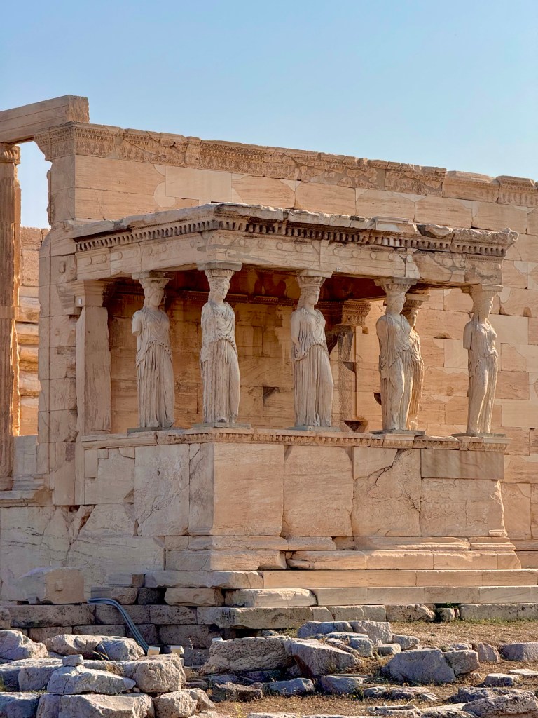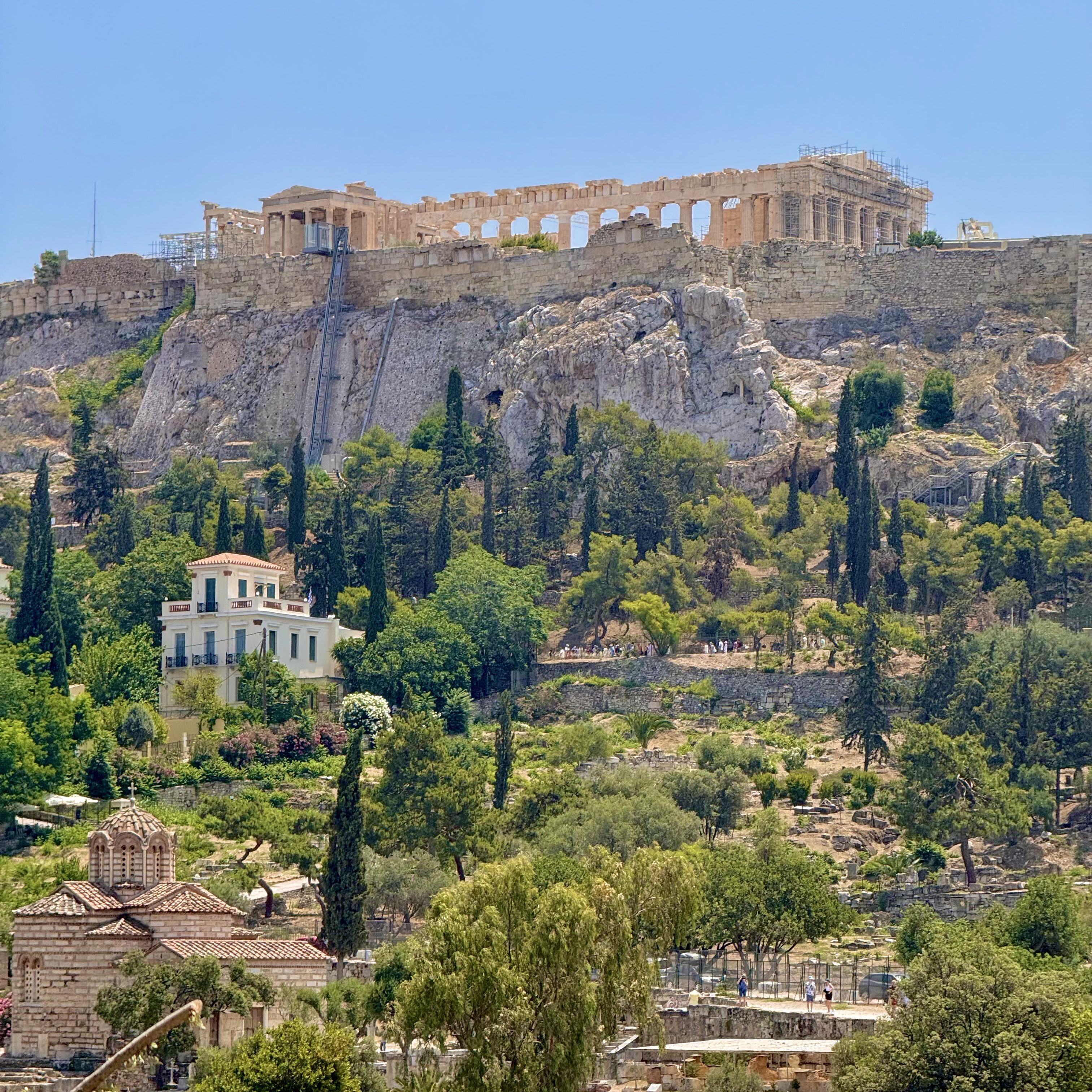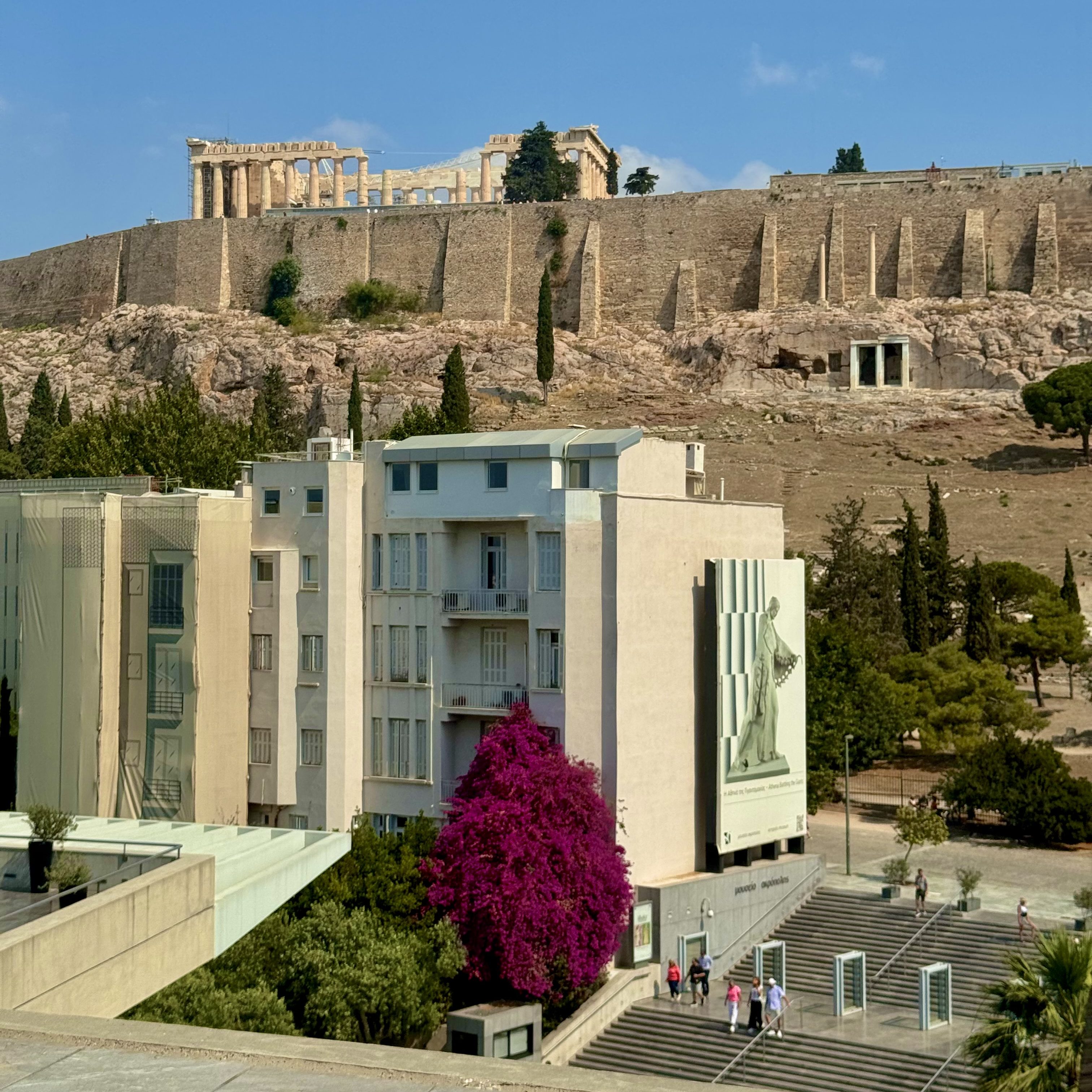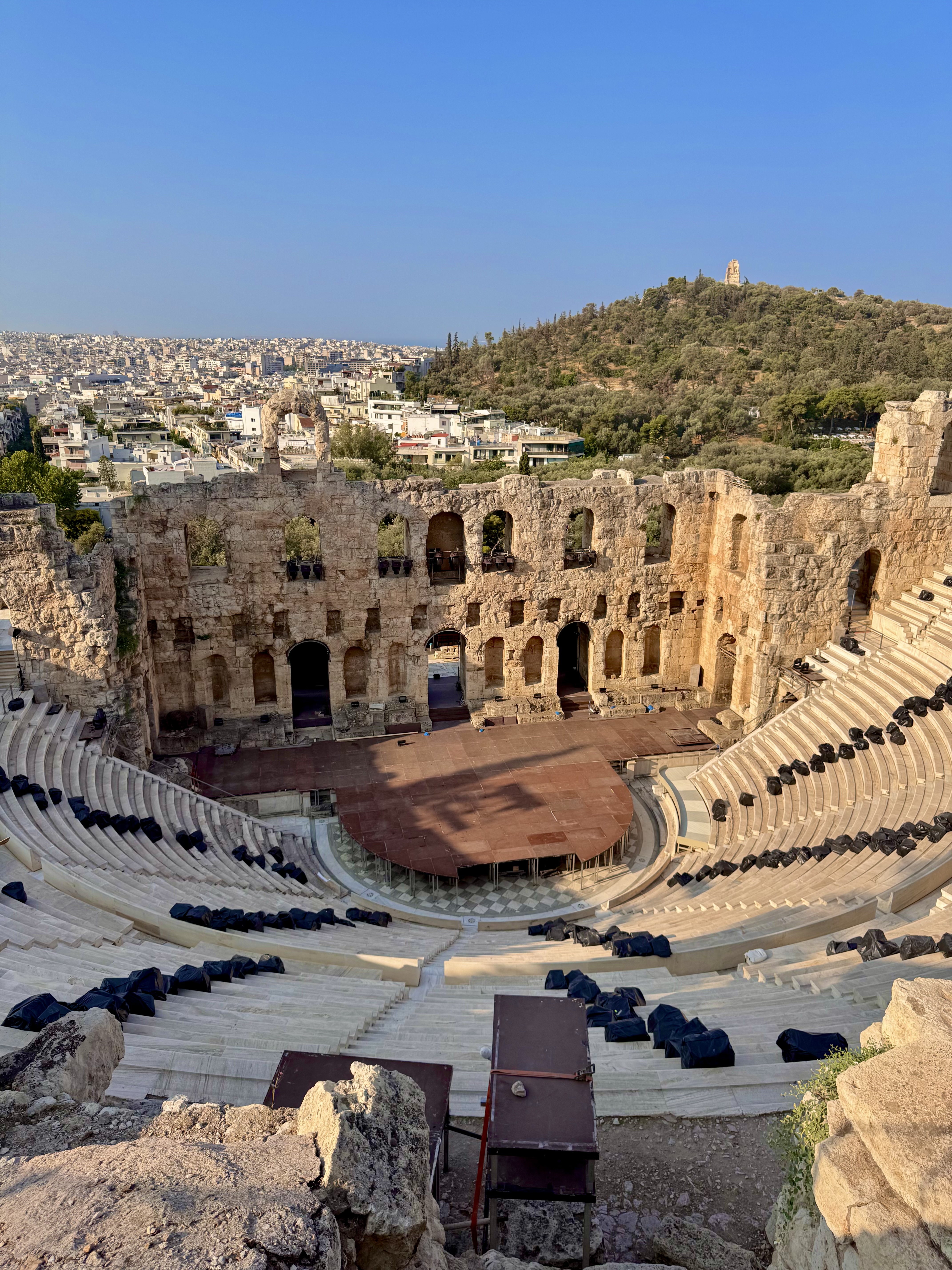 O segundo dia em Atenas foi, sem dúvidas, um mergulho na Grécia Antiga — daqueles dias que fazem a gente entender porque essa cidade é considerada o berço da civilização ocidental. Comecei o dia bem cedo, por volta das 8h, para aproveitar o frescor da manhã e evitar o calorão (e as multidões) que tomam conta da cidade a partir das 10h. Minha primeira parada foi a Acrópole de Atenas, um daqueles lugares que a gente cresce vendo em livros de história e que, ao vivo, é ainda mais impressionante. A subida já te coloca no clima: o caminho é ladeado por pedras irregulares, ruínas menores e oliveiras resistentes que parecem guardar segredos milenares. Assim que você passa os Propileus, o portal monumental de entrada, a vista se abre e você entende por que esse era o ponto mais importante da cidade. A Acrópole, que significa literalmente “cidade alta”, era o centro espiritual e simbólico de Atenas. O grande protagonista é o Parthenon, dedicado à deusa Atena, padroeira da cidade. Mesmo em ruínas, ele continua imponente: suas colunas dóricas, feitas de mármore branco que muda de cor conforme a luz do dia, são um espetáculo à parte. Ao lado, o Erecteion traz um contraste delicado com suas famosas Cariátides, estátuas femininas que sustentam o pórtico com uma elegância que desafia o tempo (mas as que estão lá são réplicas: cinco das originais estão no Museu da Acrópole e uma delas está no Museu Britânico). Mas o que muita gente não sabe é que a Acrópole vai muito além dessas duas estruturas. Logo na entrada, à esquerda, fica o Templo de Atena Nice, mais compacto, mas com uma vista belíssima e cheio de significado — ele celebrava as vitórias militares da cidade. Continuando pela encosta sul, estão os dois teatros históricos: o Teatro de Dionísio, considerado o berço do teatro ocidental, onde as primeiras tragédias gregas foram encenadas, e o Odeon de Herodes Ático, que foi reconstruído e ainda recebe apresentações de música e dança até hoje. É surreal pensar que você está pisando no mesmo chão que Sófocles, Eurípedes e Platão frequentaram. O ingresso para visitar a Acrópole custa €30 (inteira), e pode ser adquirido no site oficial (recomendo comprar com antecedência para evitar as filas, que são longas).
