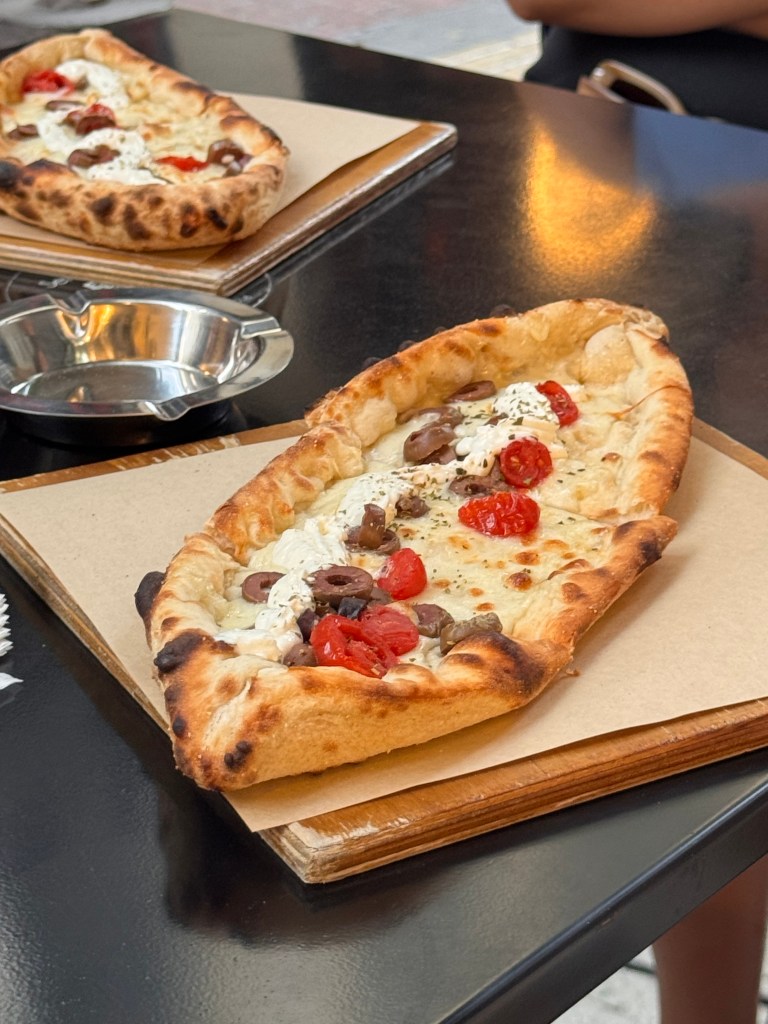 O ponto alto do dia foi o Tour Gastronômico a pé que contratei pelo GetYourGuide. O tour custa cerca de €65 por pessoa e dura umas 3 horas, uma verdadeira festa para o paladar. Começamos com o clássico gyros, aquela carne suculenta enrolada no pão pita, acompanhada de cebola, tomate e o tradicional molho tzatziki: um combo perfeito e super popular nas ruas de Atenas. Depois, provamos a famosa spanakopita, a torta folhada de espinafre e queijo feta que derrete na boca. Também experimentamos o peinirli, uma pizza grega em formato de barco, com massa macia e recheios variados, que conquistou todo mundo no grupo. Para a sobremesa, não podia faltar os loukoumades, bolinhos fritos regados com mel e canela que são uma verdadeira tentação doce. E para fechar com chave de ouro, experimentamos um bolo local servido com um sorvete diferente, que surpreendeu pelo sabor e textura únicos. A guia, além de super simpática, contou histórias e curiosidades sobre cada prato, tornando a experiência ainda mais especial e autêntica. Esse tour é uma ótima forma de conhecer a culinária grega e descobrir cantinhos escondidos da cidade que a gente dificilmente acharia sozinha. Depois do tour, fiquei com aquela sensação gostosa de ter passado por Atenas não só pelos olhos, mas pelo paladar e pelo coração, coisa que só uma viagem bem vivida pode proporcionar.