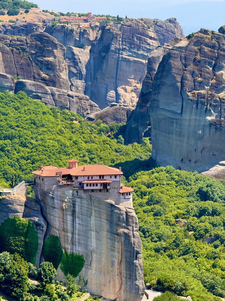 No total, visitamos três mosteiros (os mais acessíveis e abertos ao público), cada um com sua própria história fascinante, obras de arte bizantinas e vistas panorâmicas de tirar o fôlego. O mais marcante para mim foi conhecer um pouco da vida dos monges que vivem ali, especialmente do monge mais velho, que já está na casa dos 90 anos. Ele é uma figura quase lendária — vive em isolamento, e as visitas são raras; só algumas pessoas específicas da vila levam mantimentos para eles.
