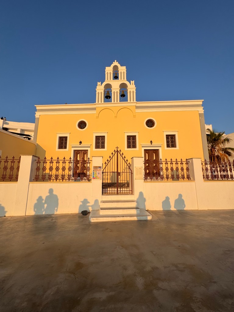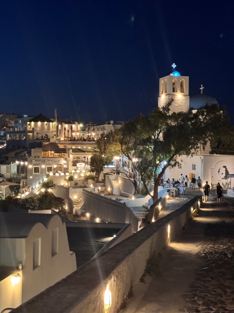 Voltando para Fira, passei pela charmosa Three Bells of Fira, aquela igreja com três sinos e cúpula azul que você já deve ter visto em todos os cartões-postais de Santorini. Pessoalmente, é ainda mais linda, principalmente pelo contraste com a vista para o mar. Apesar da fama entre turistas, é uma igreja ativa, dedicada à Virgem Maria, onde acontecem casamentos e batizados locais. O melhor ponto para foto é um mirante escondido atrás da igreja. Para encerrar, fui ao Mama Thira, um restaurante familiar em Firostefani com uma varanda perfeita para o pôr do sol. Pedi um moussaka (uma espécie de lasanha grega de berinjela e carne) e fiquei ali, vendo o céu se transformar em tons de rosa, laranja e dourado. Um daqueles momentos que parecem cena de filme. E, como ainda era cedo, aproveitei para fazer uma caminhada noturna por Fira. À noite, a cidade ganha outra atmosfera: luzes amarelas iluminam as ruelas, joalherias brilham nas vitrines, bares tocam música ao vivo e, de vez em quando, você encontra um mirante vazio só para você e o mar. Foi nesse silêncio interrompido apenas pelo som do vento que percebi: eu estava mesmo em Santorini.