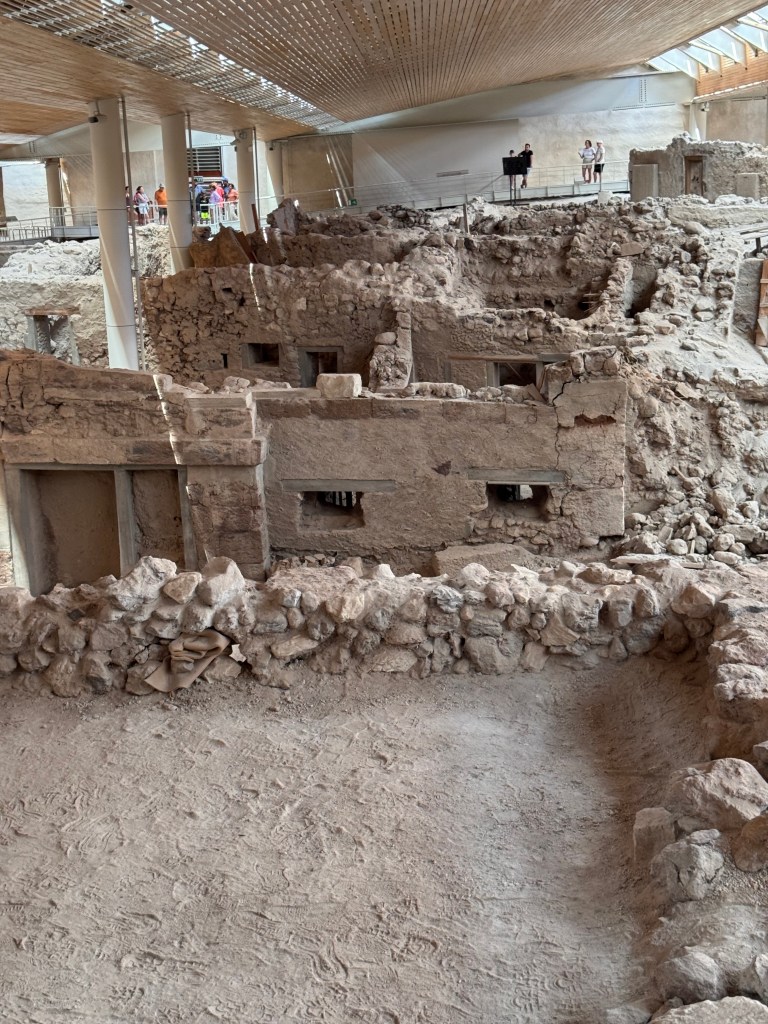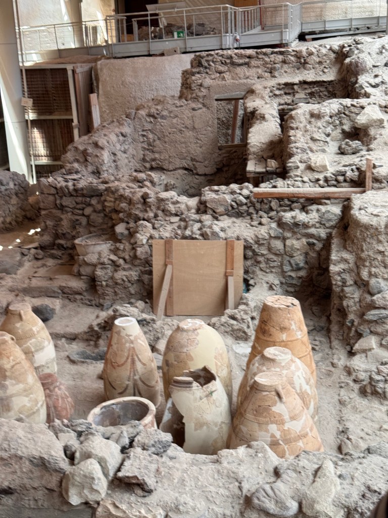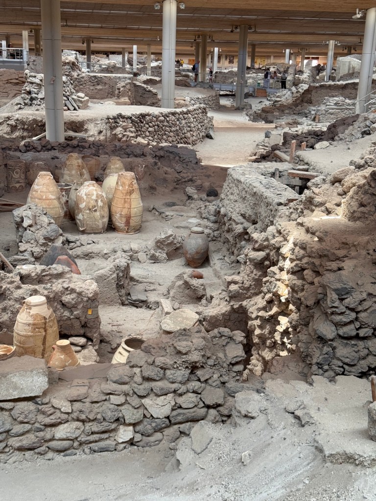 O segundo dia começou com um mergulho na história de Santorini. Como eu estava sem carro, contratei um passeio de dia inteiro com a NST Travel, que me buscou cedinho no hotel para começarmos o tour pelos principais pontos de Santorini. Começamos por Akrotiri, um dos sítios arqueológicos mais importantes do mundo. Santorini foi devastada por uma das maiores erupções vulcânicas da história, por volta de 1600 a.C. e Akrotiri é como uma “Pompéia grega”, uma cidade inteira preservada sob cinzas vulcânicas. Andar por aquelas passarelas suspensas e ver casas de dois andares, cerâmicas e até sistemas de esgoto de milhares de anos atrás é surreal – dá para imaginar a vida florescendo ali antes do desastre.