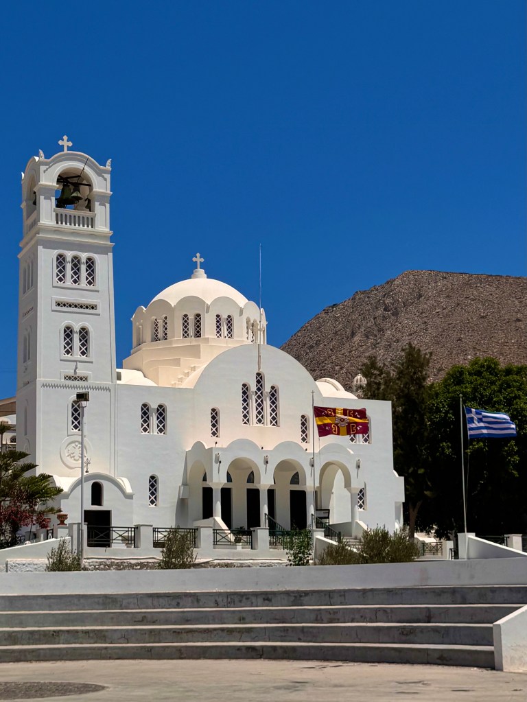 De lá, seguimos para Emporio, um vilarejo medieval cheio de ruelas estreitas e construções de pedra que parecem cenário de filme. É um dos cantinhos menos turísticos da ilha e justamente por isso tem um charme autêntico. A próxima parada foi o ponto mais alto da ilha: o Monte Profitis Ilias. Lá de cima, a vista é simplesmente de tirar o fôlego, dá para ver Santorini inteira, como se fosse um pedaço de lua flutuando no mar. Ali existe também um mosteiro ortodoxo do século XVIII, onde monges ainda vivem e produzem mel e vinho.