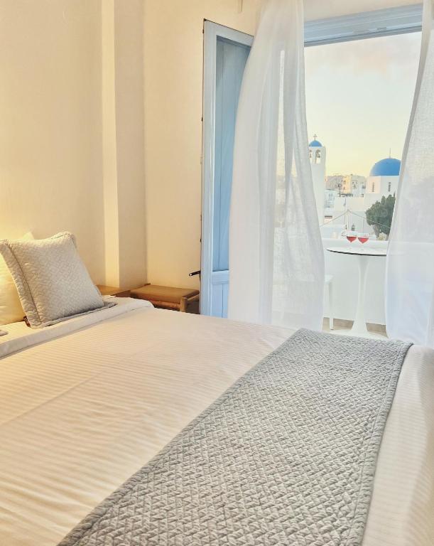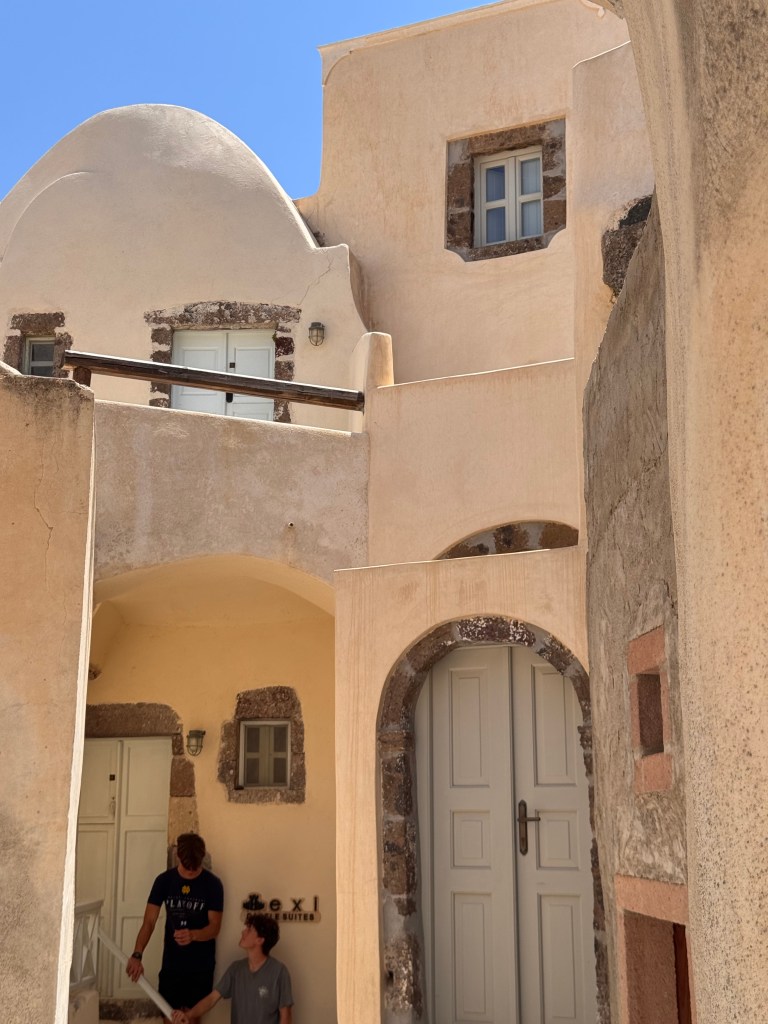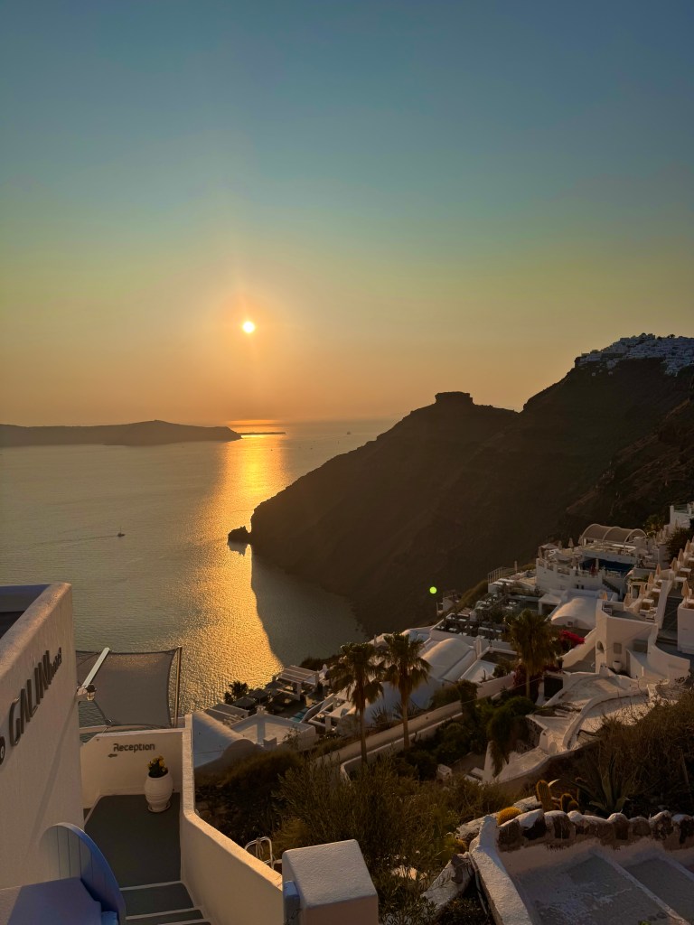 Durante meus dias em Santorini, me hospedei no Hotel Villa Fotini, em Firostefani, que é um ponto mais elevado de Fira. A localização é excelente: fica literalmente entre Fira e Imerovligli, com acesso fácil aos mirantes mais lindos para o pôr do sol e aos charmosos cafés e restaurantes do do vilarejo. O lugar combina o charme tradicional das casas cicládicas com toques modernos: quartos brancos, varanda, ar-condicionado, café, frigobar e Wi-Fi grátis. Estrutura mais simples comparado aos demais hotéis da região, mas com um excelente custo benefício e fácil acesso: o hotel fica em um ponto onde os carros conseguem transitar: logo, não precisei carregar malas pelas escadas e os passeios me pegavam na porta do hotel. Reservei um dos melhores quartos do hotel (Deluxe Room), com vista varanda com vista para os domos azuis de Agios Gerasimos e para a outra costa do mar, excelente para ver o nascer do sol. Paguei R$2.206,00 por três diárias (R$ 735 por diária), mas os valores podem variar dependendo da época do ano. Considerando a localização privilegiada, o atendimento acolhedor e o conforto oferecido, diria que o custo-benefício foi excelente – especialmente para quem quer estar perto da ação, mas sem abrir mão de tranquilidade. Mas para quem deseja uma experiência mais premium, existem uma infinidade de outros hotéis com estrutura de spa, com piscinas e jacuzzis privativas.
