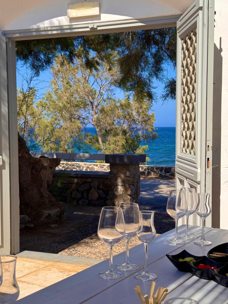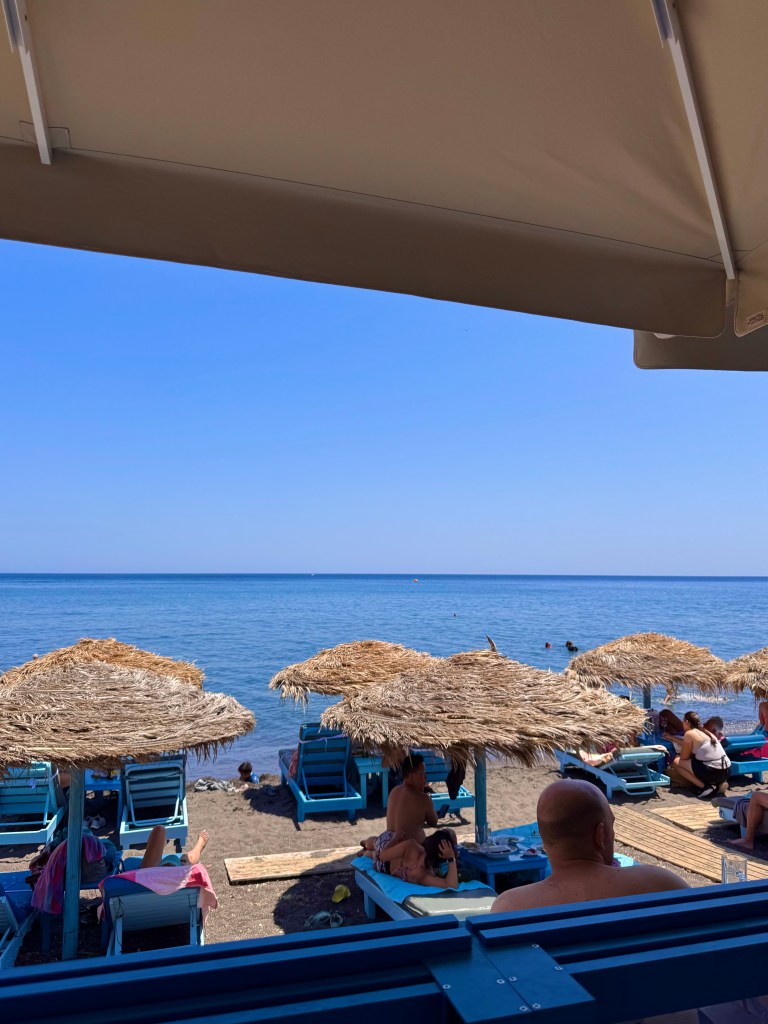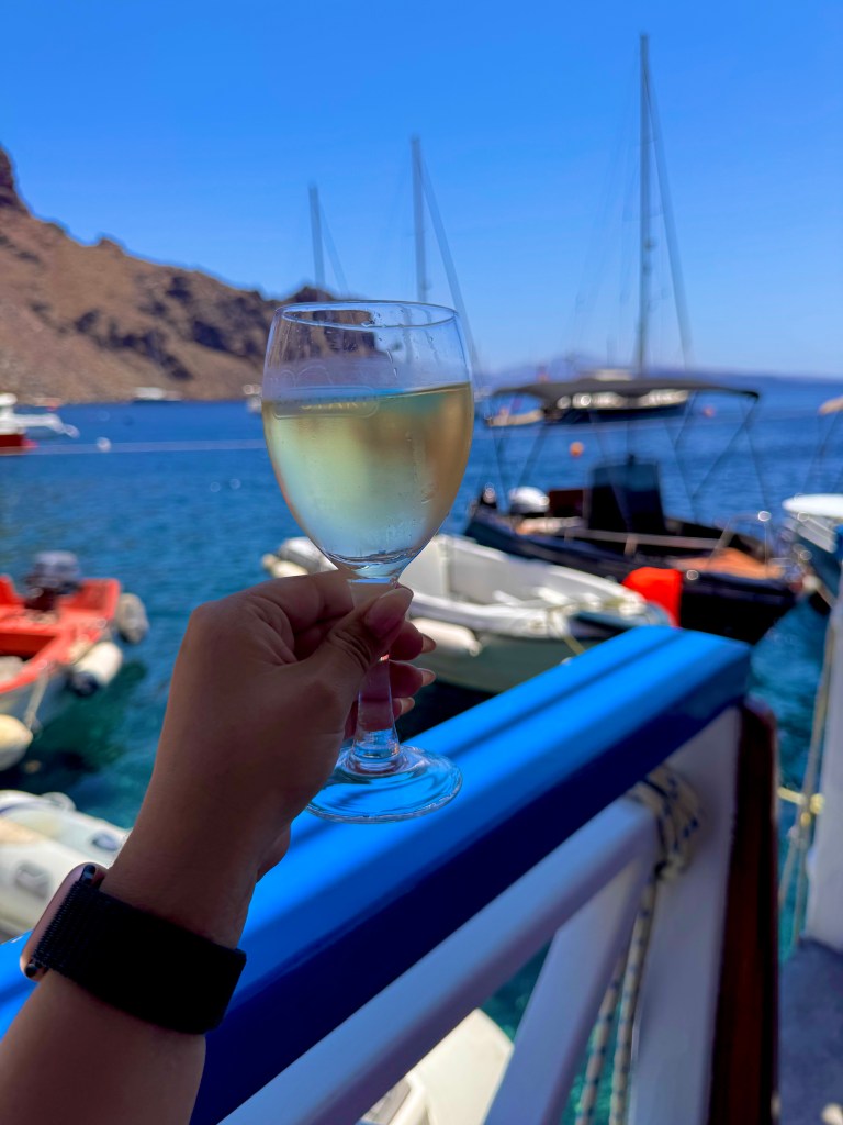 Depois de tanta história e vistas panorâmicas, hora de relaxar na Perissa Beach. Diferente das praias “cartão-postal” de água azul e areia branca, aqui a areia é preta e grossa, resultado das erupções vulcânicas – um lembrete constante da força da natureza na ilha. A estrutura é ótima, cheia de bares e espreguiçadeiras, e excelentes opções de frutos do mar. A tarde seguiu com uma das minhas partes favoritas do dia: degustação de vinhos em uma vinícola local. Sabia que Santorini é conhecida por produzir vinhos únicos graças ao solo vulcânico? A uva Assyrtiko, por exemplo, cresce em vinhas que parecem ninhos no chão, uma técnica para protegê-las do vento forte da ilha.