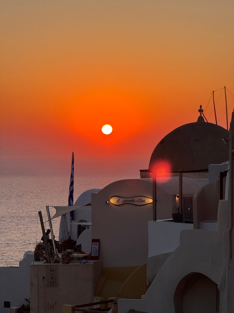 E para fechar com chave de ouro, o dia terminou com o espetáculo mais famoso de Santorini: O pôr do sol em Oia. O ônibus nos deixou lá no fim da tarde, e eu garanti um cantinho em um bar sunset para assistir ao sol mergulhar no mar, tingindo tudo de laranja, rosa e dourado. Sim, é lotado. Sim, é turístico. Mas também é absolutamente mágico, um daqueles momentos que, por mais fotos que você tire, nenhuma vai capturar o que você realmente sentiu. Voltei para o hotel cansada, mas com aquela sensação boa de ter vivido um dia inteiro de descobertas: da história milenar à simplicidade do vilarejo, da força da natureza ao prazer de um bom vinho.