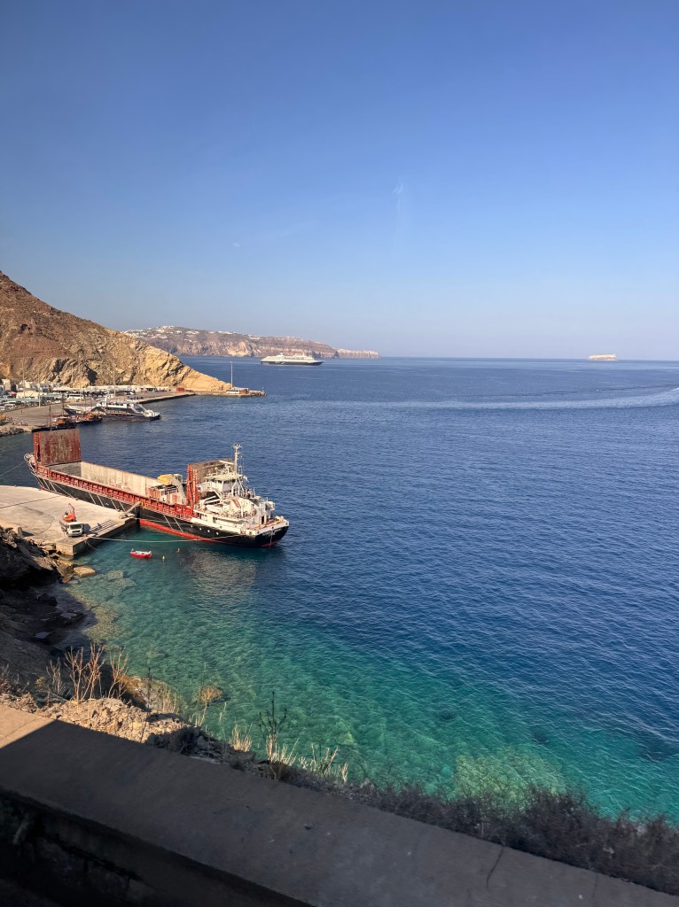 Já eu escolhi a experiência mais clássica das ilhas gregas: fui de ferry. Saindo de Mykonos, a viagem até Santorini leva em média 2h30 no ferry rápido (fui de Seajets), mas pode chegar a 5h nas embarcações convencionais. Apesar do tempo maior em relação ao voo, achei a travessia tranquila e rápida (na verdade, considerando que para vôos existe um tempo de antecedência necessária para estar no aeroporto, o tempo de deslocamento foi igual ao que seria de avião). Os ferries chegam no Porto de Athinios, o porto principal de Santorini. De lá, é preciso pegar um táxi, transfer privado ou ônibus para seguir até as principais vilas da ilha, como Fira ou Oia, já que o porto fica em uma parte mais baixa e afastada. O trajeto até Fira leva cerca de 20 minutos de carro, mas prepare-se para uma subida cheia de curvas, com vistas impressionantes das falésias – quase uma prévia do espetáculo que é Santorini.
