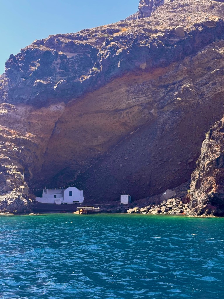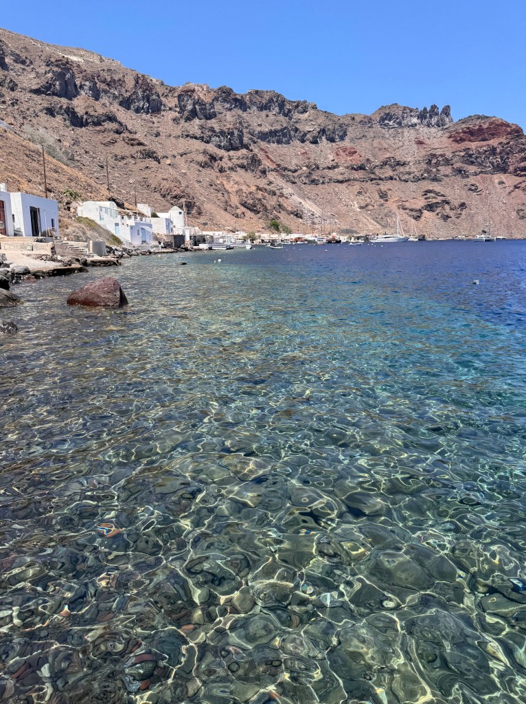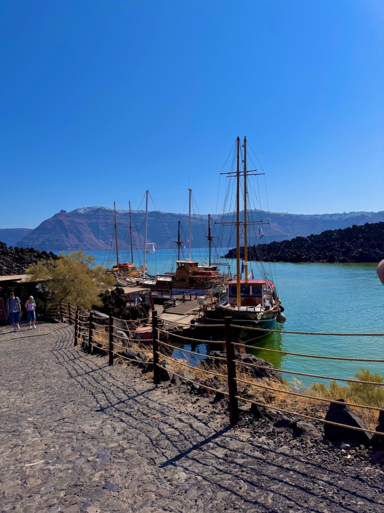 Depois, navegamos até Thirassia, uma ilha vizinha bem menos turística e que parece parada no tempo. Tivemos um tempinho livre para almoçar e explorar. Eu fiquei na base da ilha aproveitando o mar belíssimo, mas também era possível subir até Manolas, a vila principal. A subida é feita por uma escadaria interminável (ou de burrinho, se você preferir). A vila tem tavernas familiares servindo peixe fresco. Muitos restaurantes tem “estacionamento de lanchas”, pois muitas pessoas alugam pequenos barcos só para ir aproveitar o contraste delicioso da ilha versus a Santorini movimentada.