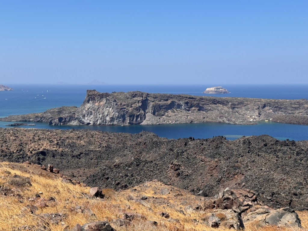 Desembarcamos em Nea Kameni e começamos a caminhada até a cratera. O terreno é árido, quase lunar, coberto por pedras vulcânicas pretas e vermelhas. Dá pra ver várias formações vulcânicas ao longo de toda a caminhada, que estão apenas adormecidas, mas ainda ativas. Lá do alto, a vista é surreal: a caldeira inteira de Santorini se abre em um semicírculo, com as vilas brancas de Fira, Imerovigli e Oia parecendo flutuar na borda do penhasco. Uma das vistas mais surpreendentes do dia.
