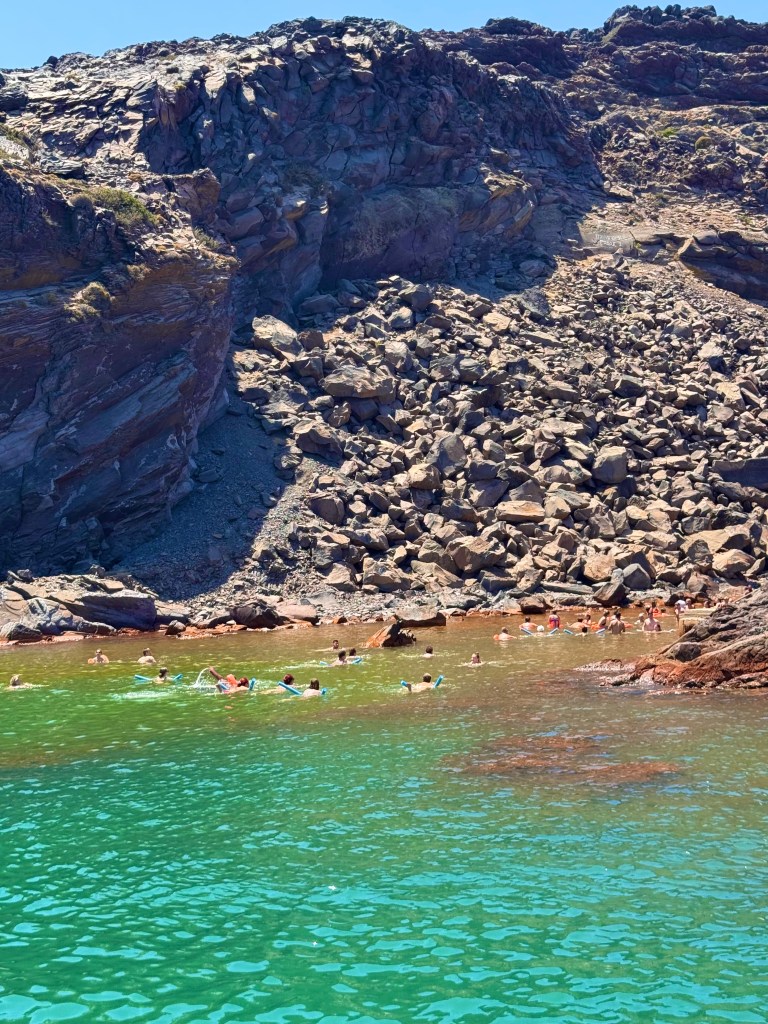 De volta ao barco, seguimos para Palea Kameni, onde há fontes termais naturais. O capitão nos avisou: “A água é quente… mas não esperem um spa!”. E ele tinha razão: o mar é frio, mas quando você chega pertinho das pedras, a temperatura sobe alguns graus e a água ganha um tom ferrugem por causa do enxofre. Mergulhar ali foi uma sensação bem diferente, pela composição, cheiro de ferro e até a textura da areia escorregadia nos pés, a experiência é de realmente nadar no coração do vulcão.