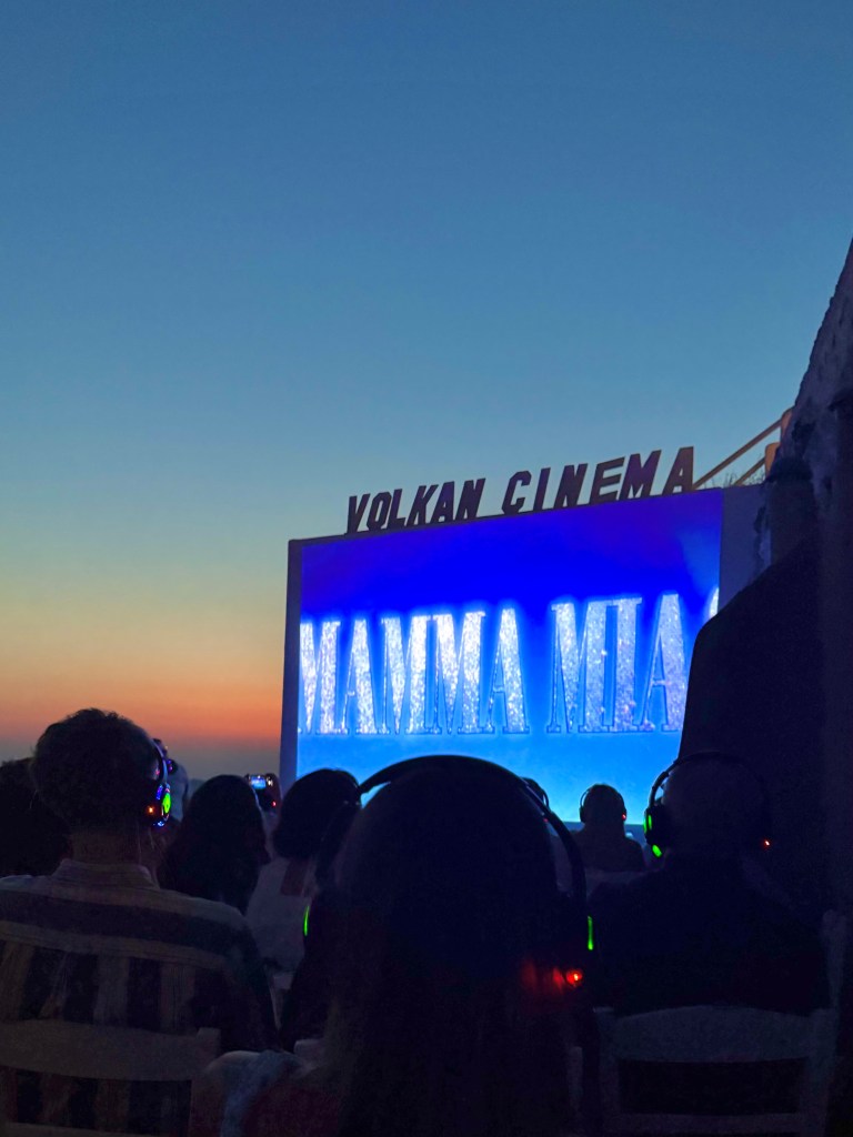 Nosso último ponto do dia foi Oia, mas dessa vez, vista pelo mar, que é outra perspectiva completamente diferente: as casas parecem esculpidas na rocha, empilhadas em níveis desordenados, com igrejas de cúpulas azuis que brilham sob o sol do fim de tarde. À noite, de volta a Fira, decidi fechar o dia com algo inusitado: um filme ao ar livre no Volcano Cinema. É um cinema pequeno à céu aberto, que fica dentro de um restaurante na beira do penhasco, com uma vista incrível para o pôr do sol. Assistir “Mamma Mia” com os tons alaranjados do sol se pondo, abrindo as portas para um anoitecer belíssimo, foi o jeito perfeito de encerrar um roteiro intenso e inesquecível por essa ilha maravilhosa.