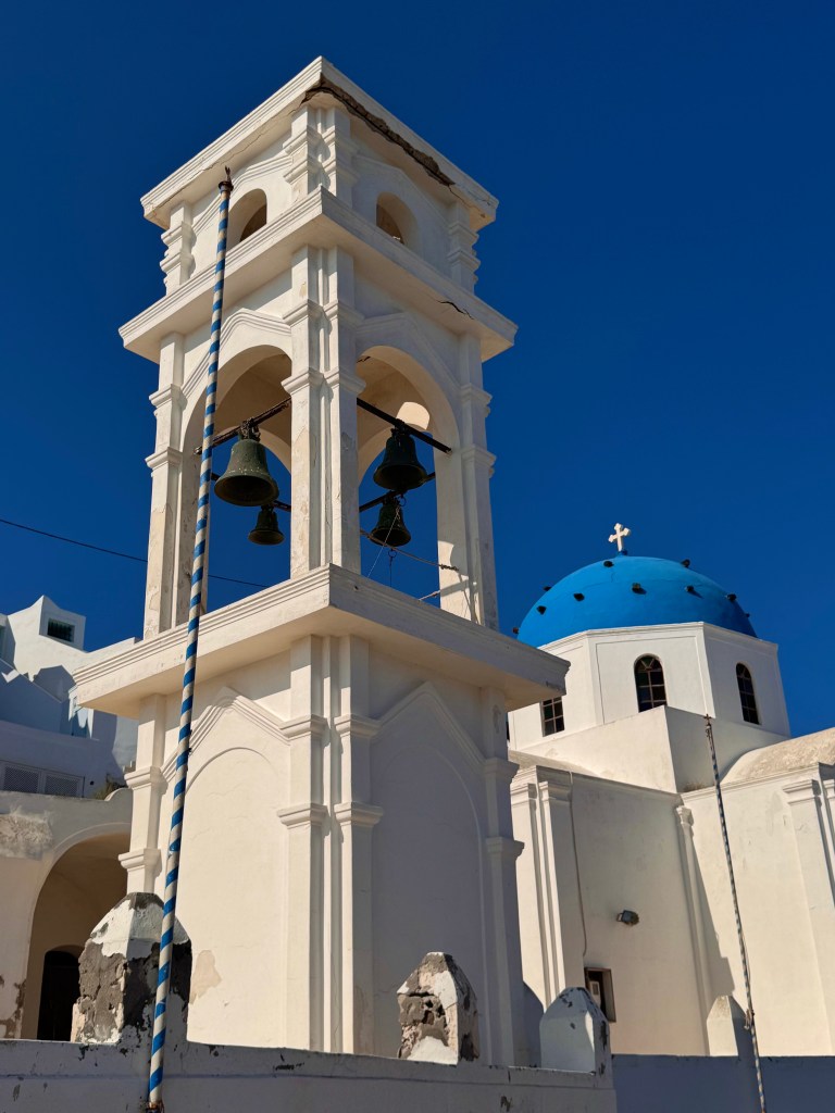 Cheguei a Santorini no início da tarde e quis começar sentindo a essência da ilha: caminhar, me perder nas vistas e ver o sol se despedir no mar Egeu. Meu ponto de partida foi a caminhada entre Fira e Imerovigli, que leva uns 20 minutos saindo de Firostefani (que é onde eu estava hospedada). É uma excelente forma de fazer uma imersão inicial, beirando a caldeira, com aquelas casinhas brancas empilhadas nos penhascos, igrejas de cúpula azul pontuando a paisagem e o mar lá embaixo, tão azul que parece pintado. Imerovigli é conhecida como a “varanda da caldeira”, porque está em um dos pontos mais altos da ilha. Dizem que o nome vem de vigla, que em grego significa “posto de observação”, e realmente, dá para ver tudo de lá. No fim da tarde; a luz dourada deixa tudo ainda mais fotogênico e o calor já está mais suave.