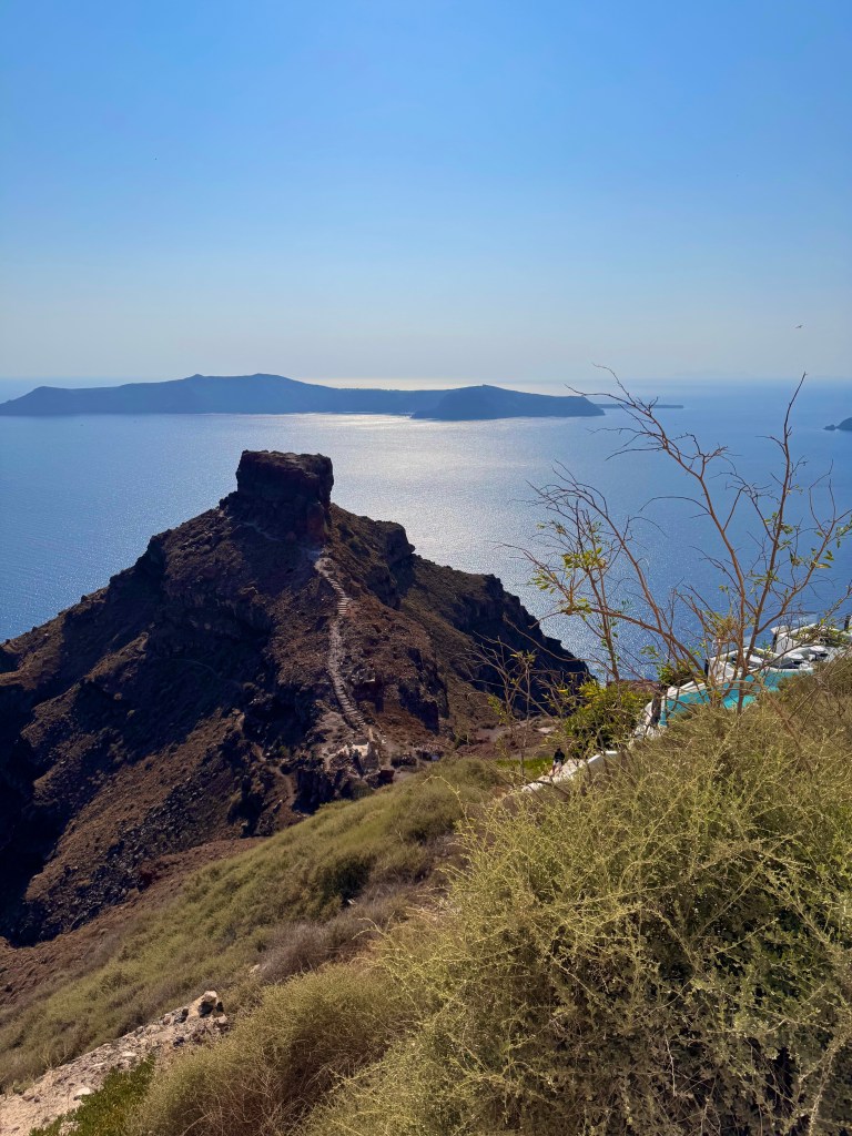 No caminho final do percurso, é possível pegar uma pequena trilha para a Skaros Rock, que é um penhasco imponente que já foi lar de uma fortaleza medieval no século XV. Naquela época, Santorini vivia sob a ameaça constante de piratas, e esse ponto alto servia de defesa natural. Hoje, restam apenas ruínas e uma sensação incrível de estar num lugar que já viu batalhas, terremotos e vulcões em erupção, e ainda assim continua firme. Subir até o topo exige um pouco de fôlego, mas a vista recompensa: 360° da caldeira, com as ilhas vulcânicas Nea Kameni e Palea Kameni ao fundo. Durante o pôr do sol, os locais dizem que Skaros “pega fogo”, porque as rochas ficam vermelhas com a luz dourada.